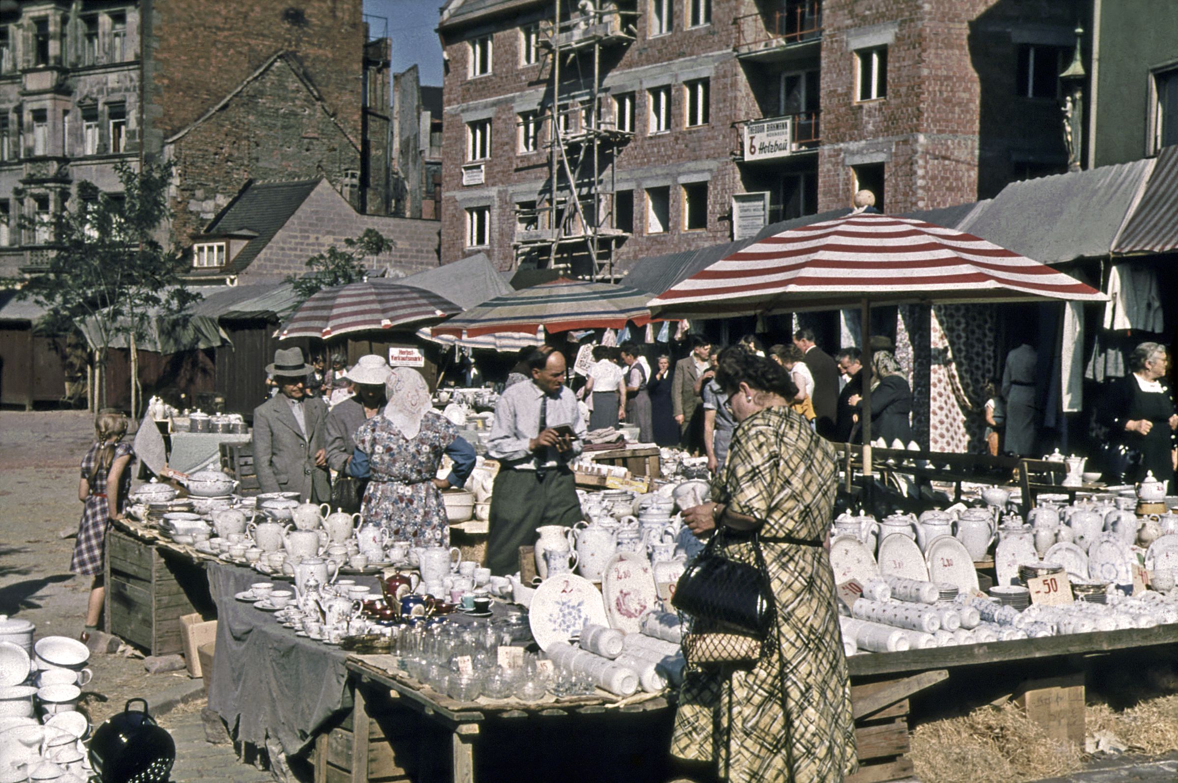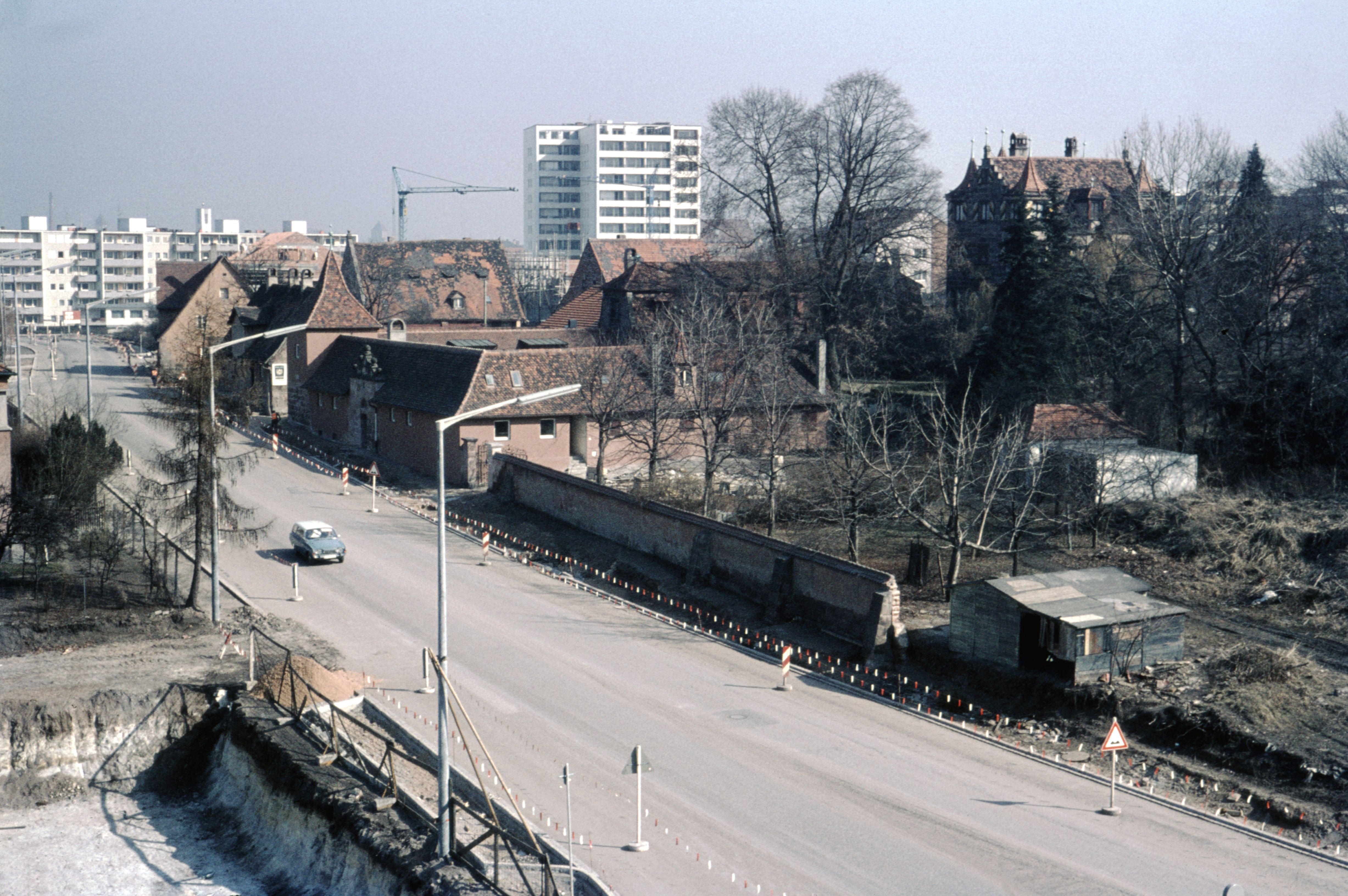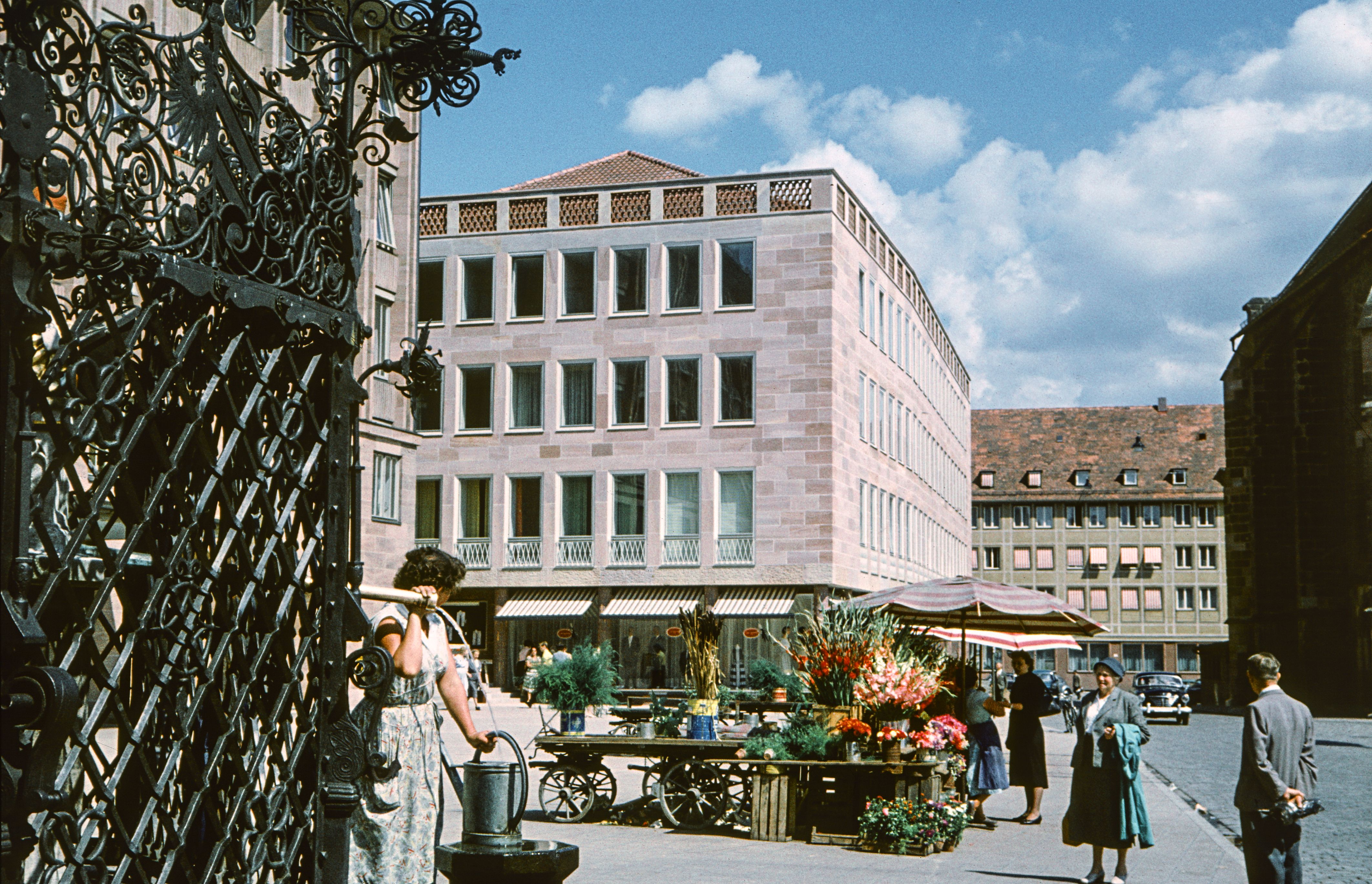 Die Bombenangriffe während des Zweiten Weltkriegs hatten in Nürnberg eine Trümmerwüste hinterlassen. Von der historischen Altstadt war kaum mehr etwas wiederzuerkennen. Doch bereits wenige Jahre nach Kriegsende wurden mit dem 1947 ausgeschriebenen Architekturwettbewerb über den Wiederaufbau der Altstadt und der Deutschen Bauausstellung von 1949 die Weichen für den Wiederaufbau gestellt. Dabei gelang es, die unverwechselbare Physiognomie Nürnbergs mit den Erfordernissen einer modernen Großstadt in Einklang zu bringen. So sind innerhalb der Stadtmauern die Wahrzeichen Burg und Stadtbefestigung, ebenso wie die mittelalterlichen Kirchen wiedererstanden, während an anderer Stelle mit dem neuen Pellerhaus am Egidienberg, der Bayerischen Staatsbank am Lorenzer Platz, dem Plärrer-Hochhaus oder der Norishalle am Marientorgraben wegweisende neue Architektur entstanden ist. Entlang des Laufertor-, Marientor- und Königstorgrabens wurden die für die 1950-er Jahre typischen Versicherungs- und Bürohäuser mit ihren Rasterfassaden hochgezogen wie man sie auch aus anderen Städten kennt. In den Vororten, aber auch in der Innenstadt war die Schaffung von Wohnraum eine vordringliche Aufgabe. Es entstand eine dichte Bebauung mit Mietshäusern und Reihenhaussiedlungen und im Südosten wuchs mit Langwasser sogar ein neuer Stadtteil empor. Weitere wichtige Anliegen stellten die Einrichtung und der Ausbau von Schulen und Kulturinstitutionen dar.