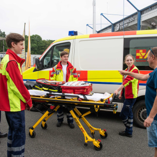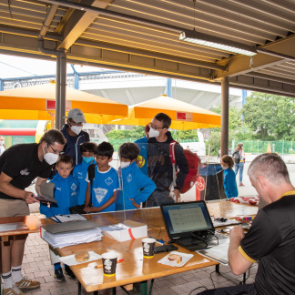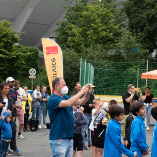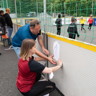 „Den Speedshot stellen wir da auf. Den Jugendamt-Pavillon dorthin, die Fahnen im Halbkreis“, dirigiert Dirk Bierholz seine Helfer. 20 Frauen und Männer aus verschiedenen Kinder- und Jugendeinrichtungen sowie vom städtischen SportService packen am Samstag, 17. Juli 2021, frühmorgens ab 7.30 Uhr mit an. Die Zeit drängt, denn die Finalrunde beginnt bereits um 10 Uhr.