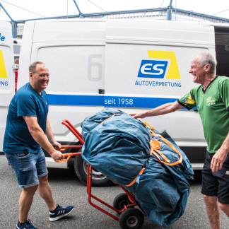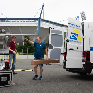 Dirk Bierholz hat seine Augen und Hände auf dem ganzen Platz. Gerade plagt er sich mit einem schweren blauen Bündel auf einer Sackkarre ab. Darin befindet sich das Speedshot genannte Sportradar, eine Geschwindigkeitsmessanlage für Bälle. Kurze Zeit später ist er eine Ecke weiter, markiert, wo die Helfer die Courts mit den Spielfeldern aufbauen sol len. Als nächstes weist er den Bühnentruck ein. Anderen Unterstützern zeigt er die über dachte Stelle am Eingang, an der die Biertischgarnituren mit dem Anmeldeschalter stehen sollen.