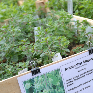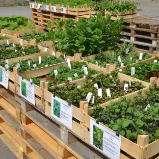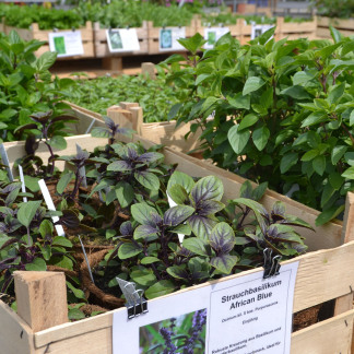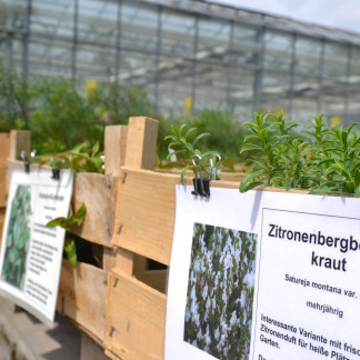 Sauber in Reihen auf Paletten gestapelt stehen sie da: Kisten voller Gärtnerglück. Gucken, schnuppern, lesen: kubanisches Strauchbasilikum, Zitronenbergbohnenkraut, Kärntner Nudelminze, Kaugummistrauch. Wer einmal angefangen hat, die Zettel an den Kräuterkisten zu studieren, hört so schnell nicht mehr auf.