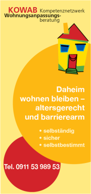 Das „Kompetenznetzwerk Wohnungsanpassungsberatung – KOWAB“ ist ein Zusammenschluss, der das Wissen von Fachleuten zu diesem komplexen Thema bündelt. Kooperationspartner sind u.a. das Seniorenamt der Stadt Nürnberg, der Pflegestützpunkt, der VdK, das Zentrum aktiver Bürger (ZAB) und die Handwerkskammer Nürnberg für Mittelfranken (HWK). Geschulte ehrenamtliche Mitarbeiterinnen und Mitarbeiter führen auf Wunsch eine kostenlose Wohnberatung zu Hause durch. Die Beratung erfolgt abgestimmt auf die individuelle Lebenssituation, ist neutral und unverbindlich.