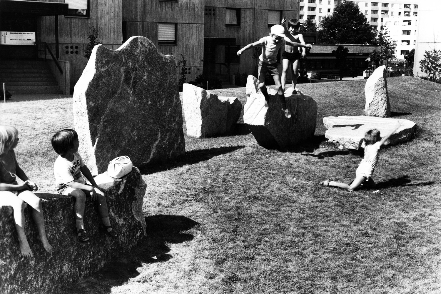 gruppiert. In einer gleichsam hierarchischen Ordnung läuft das Ensemble auf ein Brunnenbecken zu, das mit einem Wasserzulauf versehen ist. Offensichtlich war das Kunstwerk vor allem für die Anwohner *innen und Kinder zur Erholung bestimmt; der assoziative Bezug zu einer Tierherde, die zur Tränke zieht, gibt ihm eine spielerische Note. Gleichzeitig strahlt die Arbeit etwas Archaisches aus und ruft mystische Steinformationen in Erinnerung. Die grob behauenen Steine sind in ihrer Form weitestgehend belassen, lediglich die Oberflächen wurden geglättet und schmale Rillen eingraviert. So kommt hier ein uraltes Konzept japanischer Gartengestaltung zum Vorschein: über eine ästhetische Form die Schönheit der Natur zum Ausdruck zu bringen.