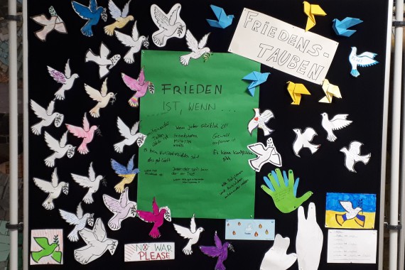 Als Schule mit Courage und für Frieden haben einige Klassen im Religionsunterricht Friedentauben, Friedensgebete und Friedensplakate erstellt: