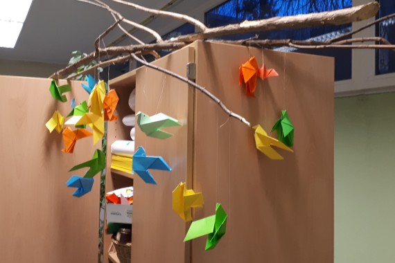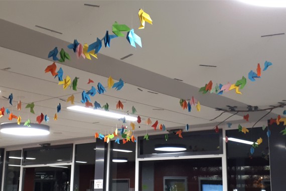 „Stell' dir vor es ist Krieg und wir gehen alle nicht hin...“, so besingt Johannes Oerding den Frieden und die Schülerinnen und Schüler der Veit-Stoß-Realschule antworten dem Sänger auf seine Frage „Wo sind die weißen Tauben hin?“ mit einem Meer bunter Origami-Friedentauben. Schülerinnen und Schüler vieler Länder und Nationen teilen sich bei uns das Klassenzimmer und bilden eine bunte Schulfamilie. Gemeinsam lernen wir und es entstehen viele Freundschaften. Darauf können wir stolz sein und gleichzeitig müssen wir diesen Schatz des Friedens pflegen und erhalten.