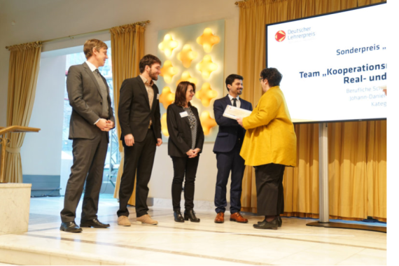 Insgesamt wurden 21 Auszeichnungen an Pädagogen und Projekte aus neun Bundesländern vergeben. In der Kategorie „Unterricht innovativ“ gewann das Kooperationsmodell zwischen der Nürnberger Berufschule 2 (Mittelfränkisches Kompetenzzentrum für Fertigungstechnik und Mobilität), der Veit-Stoß-Realschule und der Johann-Preißler-Mittelschule einen der drei Sonderpreise. Frau Kerstin Jonczyk-Buch, Fachbetreuerin Naturwissenschaften an der VSR nahm den Preis für die Veit-Stoß-Realschule in Berlin entgegen.