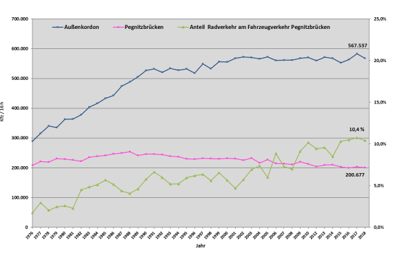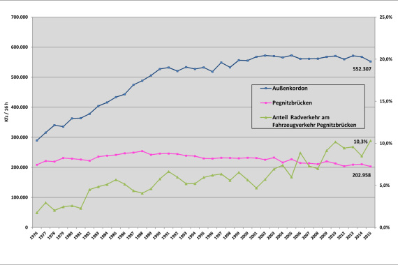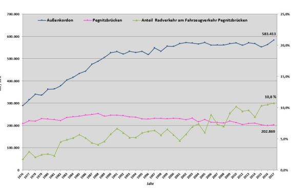 Die Summe der Fahrzeuge auf allen Pegnitzbrücken repräsentiert den Nürnberger Binnenverkehr. Die Entwicklung des innerstädtischen Verkehrs ist seit Jahrzehnten weitgehend stabil.