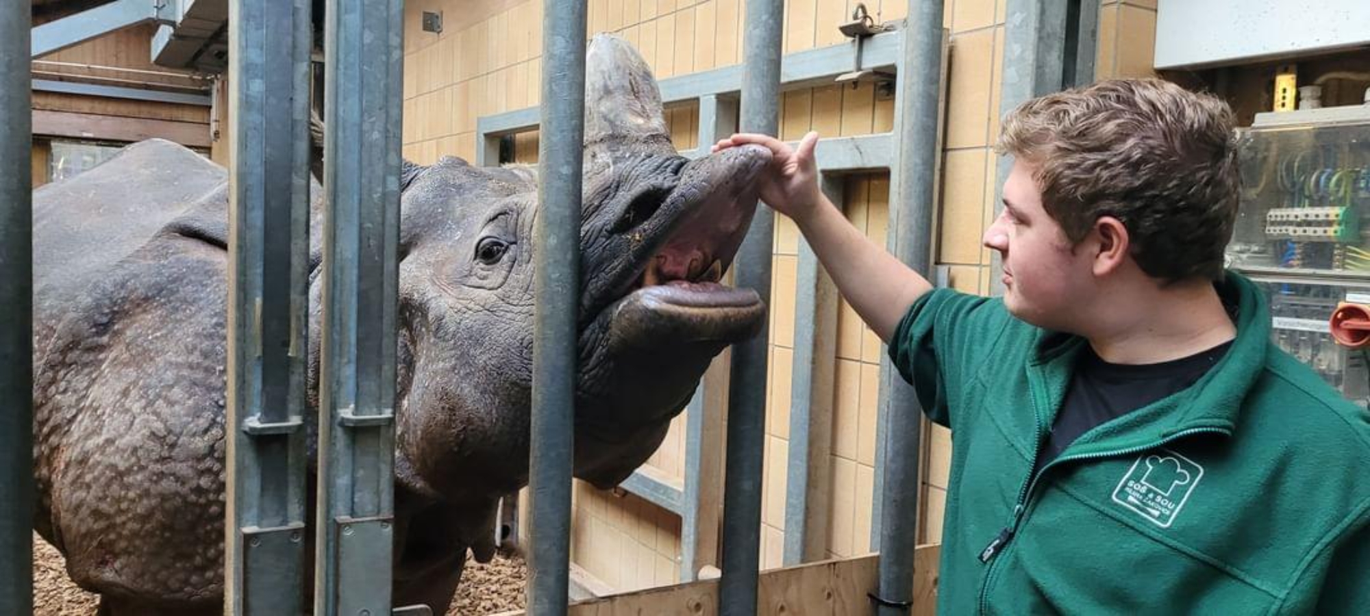 Panzernashorn-Dame Sofie ist eine beachtliche Erscheinung. Ausgewachsene Weibchen werden bei einer Höhe von rund 1,60 Metern bis zu 1 600 Kilogramm schwer. Filip Střížka streichelt vorsichtig über die Oberlippe des Tiers. Die Nashorn-Pflege gehörte für den 18-Jährigen und seinen gleichaltrigen Kollegen Tomáš Čmedla aus Tschechien zu den Highlights ihres Auslands-Praktikums im Tiergarten Nürnberg. Im Rahmen des Programms „Freiwillige Berufliche Praktika“ sammelten die beiden angehenden Tierpfleger aus Prag vier Wochen lang Berufserfahrung in Deutschland.