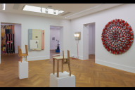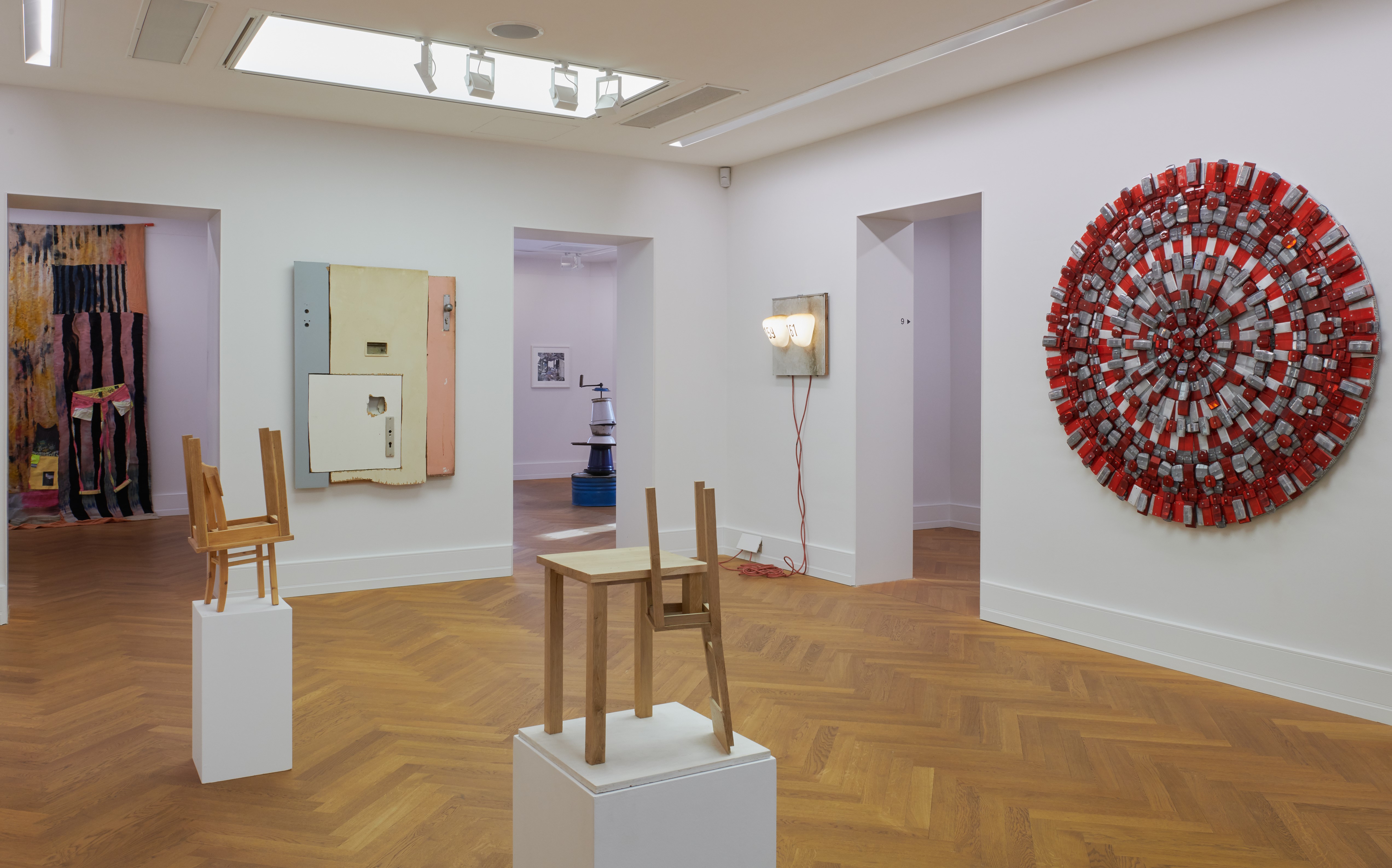 In Raum 8 steht ein Tisch. Der Tisch ist das verbindende Element aller bisherigen Domizile des Borgo Ensembles. Er ist Ort der Zusammenkunft, der Geselligkeit und manchmal auch des Disputs. In der Kunstvilla lädt er die Besucherinnen und Besucher ein, sich niederzulassen, ins Gespräch zu kommen und den 2012 gedrehten Film „Borgo Ensemble – Kunst & Freundschaft“ von Martin Mittmann anzusehen, flankiert von Porträts von Künstlerinnen und Künstlern des Borgo Ensembles, die Hans Lorenz aufgenommen hat. Werke von Reiner Bergmann verweisen auf den ehemaligen Standort an der Stadtgrenze: von den Hausnummern bis zu „Wohnungstüren“, die auseinandergenommen und wieder zusammengesetzt wurden. Eine Assemblage ist auch Lisa Haselbeks großformatige Arbeit „Power Flower“ (2020-2023), die aus ausrangierten Fahrradreflektoren besteht. Assoziationen an Dartscheiben wie an Rosetten gotischer Kirchen drängen sich auf. Auch Eva-Maria Neubauers Installation mit zwei darauf gehängten Papierarbeiten lässt an Mauerwerk denken, und ist doch aus zusammengenähten Nylonstrümpfen gefertigt. Georg Baier bezieht sich mit seinen unbetitelten und doch im Bild beschrifteten Papierarbeiten auf Konsum und Warenwelt, ähnlich wie Reiner Zitta, der mit seiner Installation wehmütig fragt: „Wo sind all die Blumen hin?“ Seine Blumen sind aus Abfallmaterialen gefertigt, anrührend, zerbrechlich und zugleich an die Wohnlichkeit früherer Fensterbänke erinnernd. Clemens Lang untersucht mit seinen Siebdrucken „Form 1, 2 und 5“ von 2023 den Kontrast zwischen Schwarz und Rot, die von Hellblau und Rosa bedrängt werden.