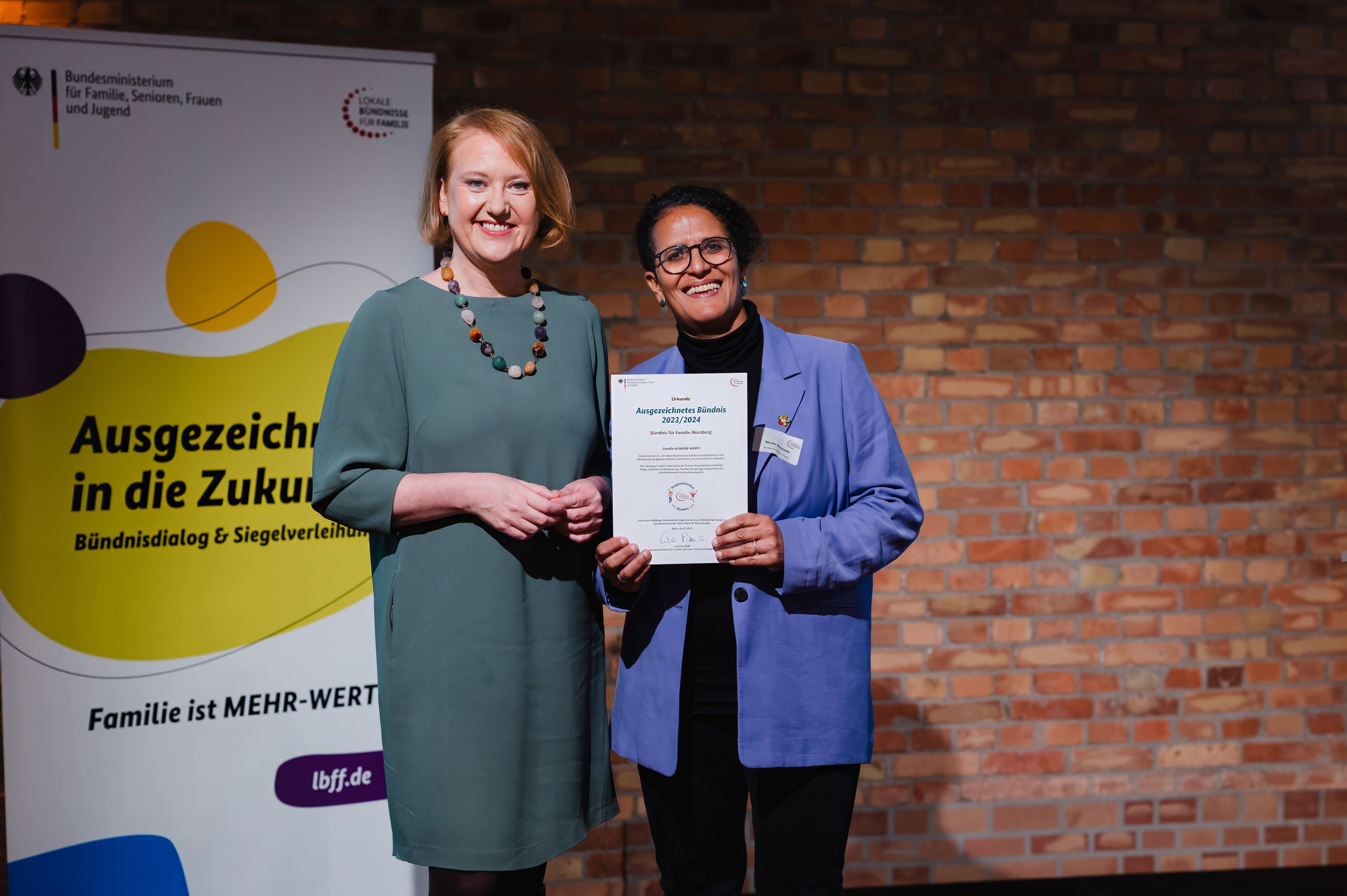 Unter dem Motto „Ausgezeichnet in die Zukunft“ hat Bundesfamilienministerin Lisa Paus am Freitag, 24. November 2023, in Berlin 56 Bündnisse für Familie aus ganz Deutschland für ihr familienpolitisches Engagement vor Ort gewürdigt. Auch das Nürnberger Bündnis war dabei. Es entstand bereits 2001 und war damit Vorreiter und Vorbild für inzwischen mehrere hundert Bündnisse deutschlandweit. Die Initiative „Lokale Bündnisse für Familie“ des Bundesfamilienministeriums unterstützt den Aufbau und die Weiterentwicklung.
