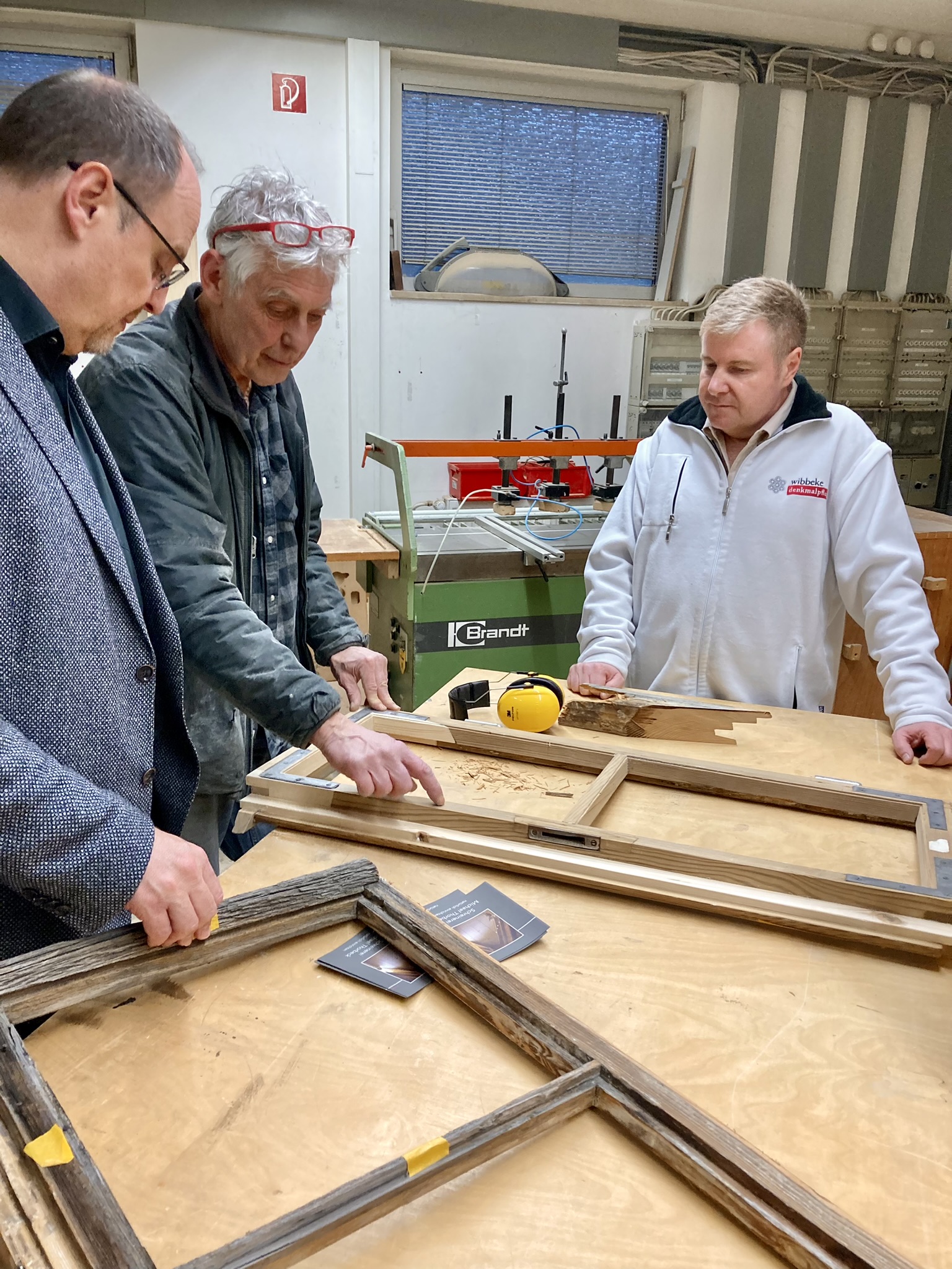 Bürgermeister Vogel hat sich die Arbeiten dort angesehen. Die bei Paderborn beheimatete Firma Wibbeke Denkmalpflege GmbH ist beim Volksbad nicht nur für sämtliche Fenster zuständig, sondern auch für die Türen, die ebenso fachmännisch überarbeitet werden. „Es ist wirklich schön zu sehen, wie sorgfältig jedes Original-Fenster behandelt wird, damit es die nächsten einhundert Jahre wieder an seinem angestammten Platz im Volksbad verbleiben kann. Man merkt, wenn man mit den Arbeitern spricht, dass sie mit Stolz bei der Sache sind und das sieht man auch am Ergebnis. Ich bin sicher, dass auch die Nürnbergerinnen und Nürnberger es erkennen und schätzen werden, wie aufwändig wir bei der Sanierung vorgegangen sind. Denn nur so behält das Volksbad seinen Charme und seine Seele“, betont Bürgermeister Christian Vogel.