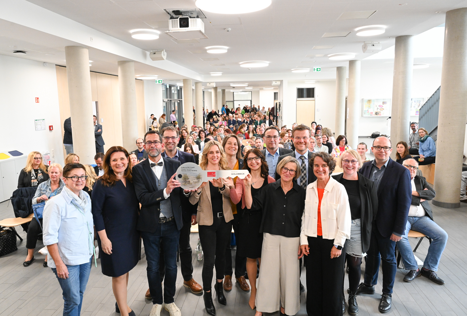 Neben zahlreichen Gästen aus Politik und Verwaltung nahmen an der Feier Oberbürgermeister Marcus König, der Referent für Finanzen, Personal und IT, Thorsten Brehm, die Referentin für Schule und Sport, Cornelia Trinkl, die Referentin für Jugend, Familie und Soziales, Elisabeth Ries, Planungs- und Baureferent Daniel F. Ulrich sowie Carsten Hense, Geschäftsführer der Goldbeck Public Partner GmbH, teil. Am Ende des von Schülerinnen und Schülern gestalteten feierlichen Rahmenprogramms überreichte Carsten Hense den Leitungen von Grundschule und Hort sowie der Mittelschule den symbolischen Schlüssel für die drei Einrichtungen.