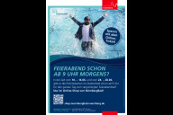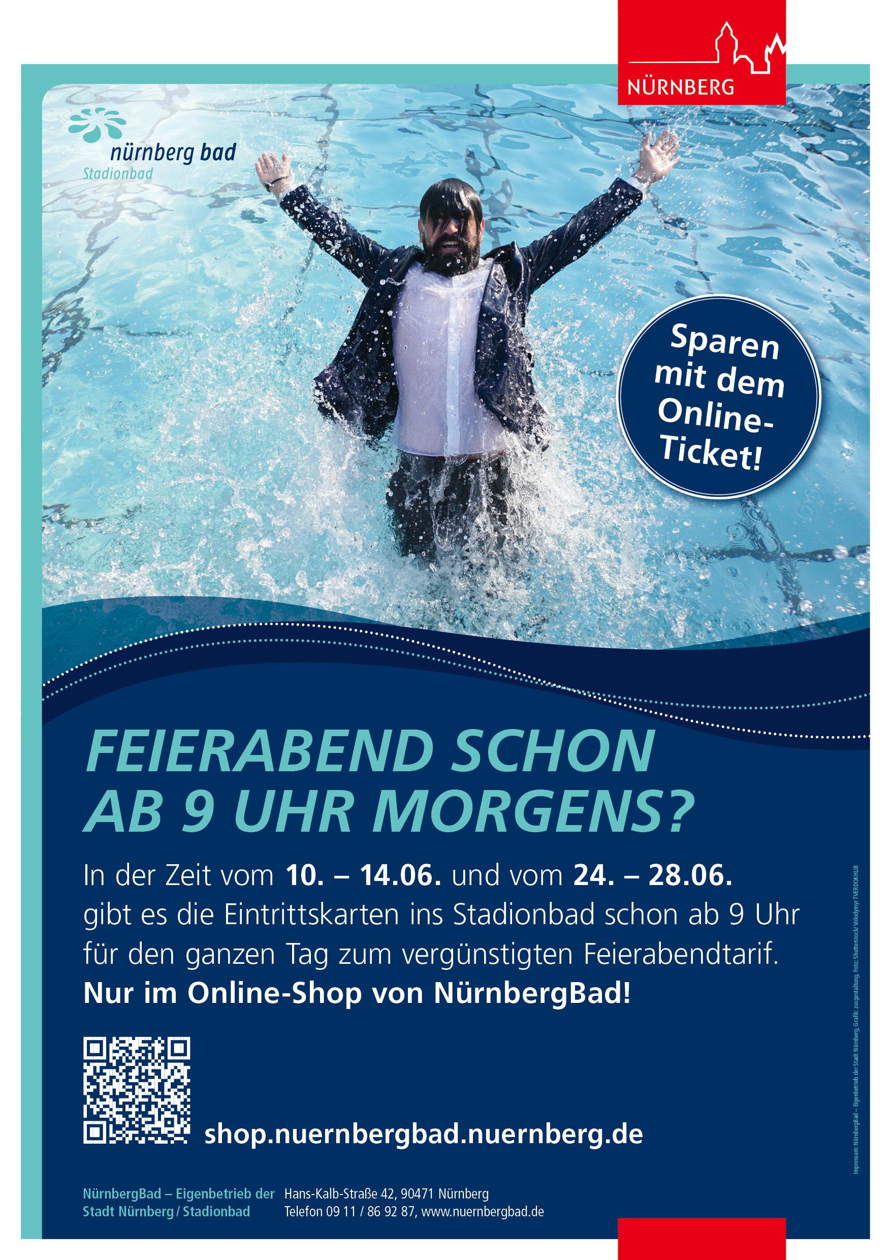 Wer die nächsten Wochen ins Stadionbad will und die Eintrittskarte online kauft, wird belohnt: Eine Aktion von NürnbergBad von Montag bis Freitag, 10. bis 14. Juni, sowie nochmals vom 24. bis 28. Juni 2024 ermöglicht den Eintritt ins familienfreundliche Stadionbad, Hans-Kalb-Straße 42, zum Preis des günstigeren Feierabend-Tarifs bereits ab 9 Uhr morgens. Erwachsene bezahlen 3,70 statt 5,40 Euro; Kinder und Jugendliche 1,80 statt 2,60 Euro für den ganzen Tag – aber nur, wenn das Ticket über den Online-Shop von NürnbergBad erworben wird. Eine Familie mit zwei Erwachsenen und bis zu drei Kindern kann beispielsweise für nur 8,80 Euro einen ganzen Tag lang baden gehen.