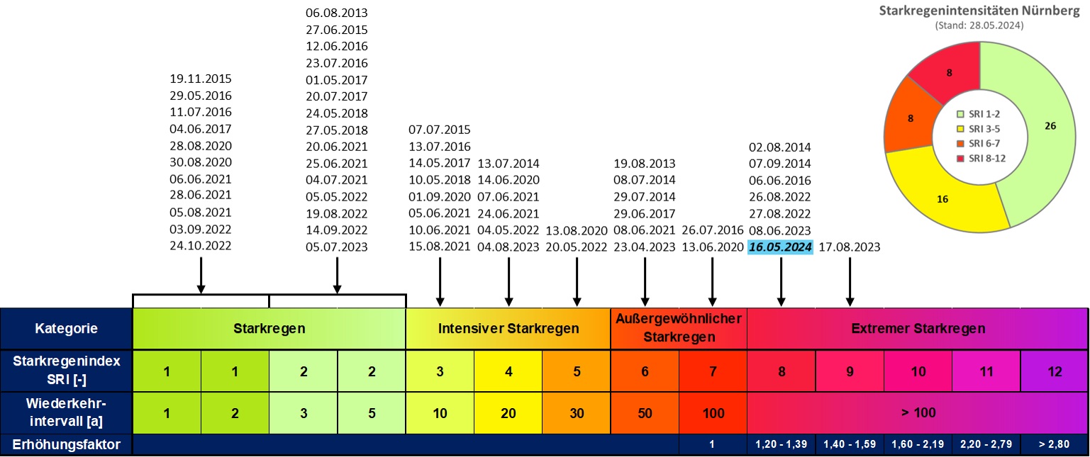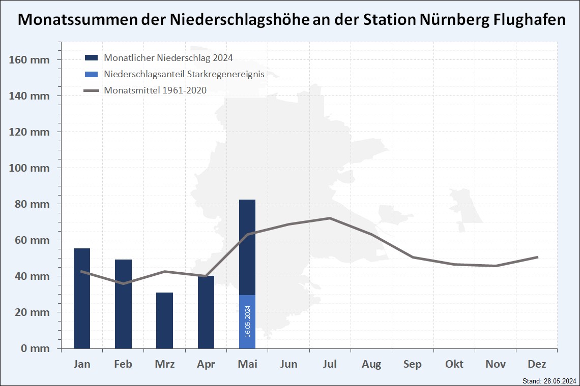 Als „Außergewöhnlicher Starkregen“ mit der Stufe 6 wurde der Niederschlag in Buchenbühl und mit der Stufe 5 (Intensiver Starkregen) in der Karl-Schönleben-Straße eingruppiert. Deutlich weniger intensiv zeichnete sich das Geschehen mit Stufe 2 (Starkregen) an der Messstation in Worzeldorf sowie an den Messeinrichtungen in Buch, der Löwenberger Straße und der Heinrich-Alfes-Straße mit jeweils Stufe 1 ab. Die übrigen Regenmesser verzeichneten keine relevanten Niederschlagsintensitäten. Die vom Deutschen Wetterdienst betriebene Klimastation am Flughafen Nürnberg zeigte am 16. Mai 2024 einen Gesamtniederschlag von rund 27 l/m2, was etwas mehr als ein Drittel des bisherigen Mai-Niederschlags ausmacht.