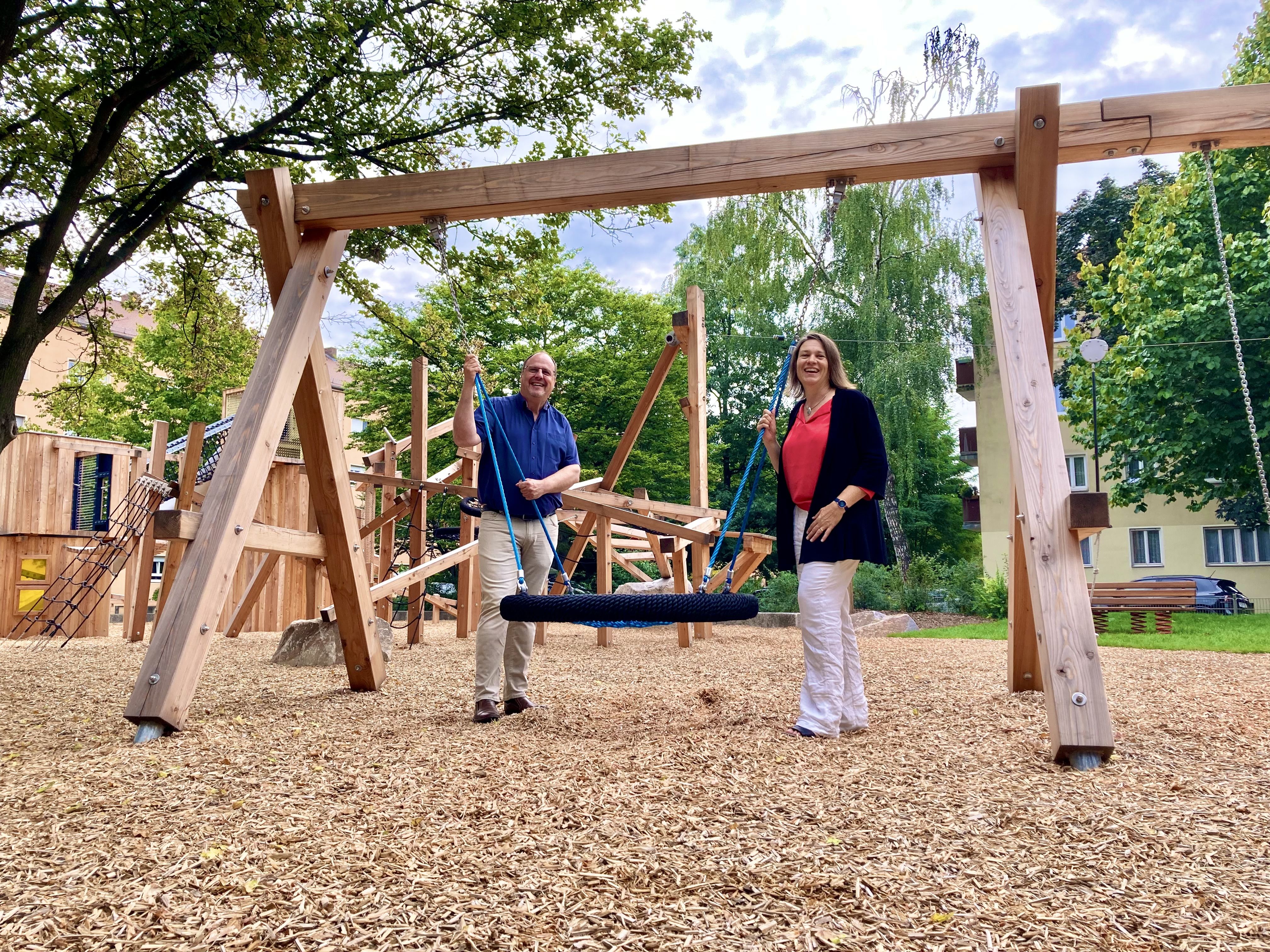 Der Spielplatz am Jean-Paul-Platz kann nach seiner umfangreichen Sanierung und Neugestaltung wieder genutzt werden. Anfang September 2024 hat Christian Vogel, Bürgermeister und Erster Werkleiter des Servicebetriebs Öffentlicher Raum Nürnberg (Sör), gemeinsam mit Elisabeth Ries, Referentin für Jugend, Familie und Soziales, den Spielplatz der Öffentlichkeit übergeben.
