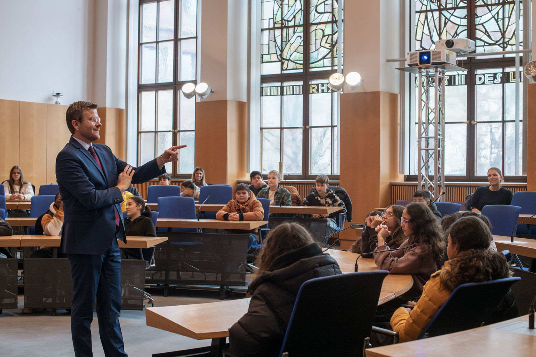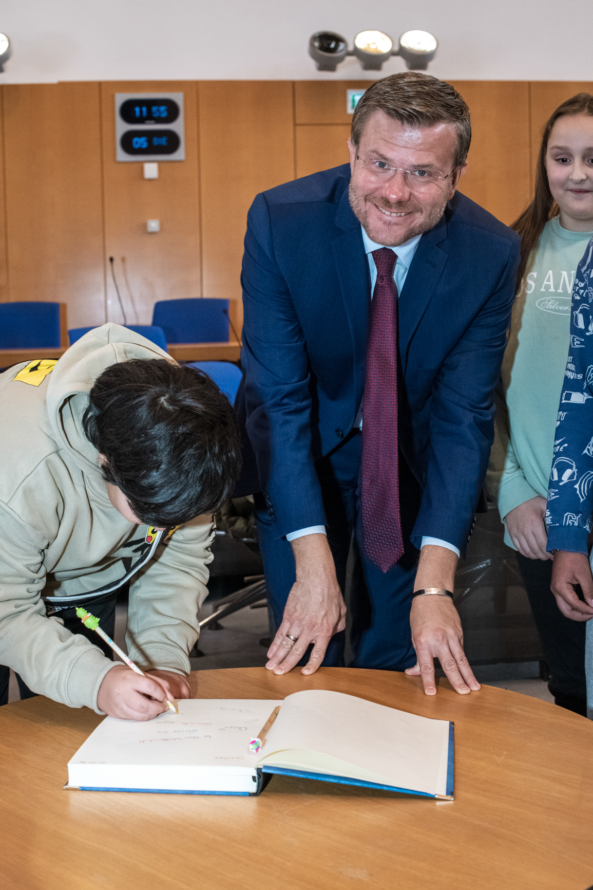 „Mir ist es wichtig, dass es solch ein Buch auch für die vielen jungen Besucherinnen und Besucher gibt. Sie sollen ebenfalls die Ehre bekommen, sich in der Herzkammer der Demokratie in ein Gästebuch eintragen zu können“, betont Oberbürgermeister Marcus König. „Das ist ja schon etwas Besonderes.“ So empfanden es auch die rund 45 Schülerinnen und Schüler der Dr.-Theo-Schöller-Mittelschule nach einer ausführlichen Fragerunde mit dem OB. Jede der drei Klassen bekam eine eigene Seite. Die Gelegenheit, den Anfang zu machen in solch einem außergewöhnlichen Buch, bekommen die Kinder eben nicht alle Tage. Der Beginn einer Tradition. Die ersten Einträge in das klassische Goldene Buch der Stadt Nürnberg erfolgten immerhin schon ab dem Jahr 1897. fra