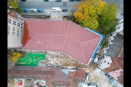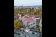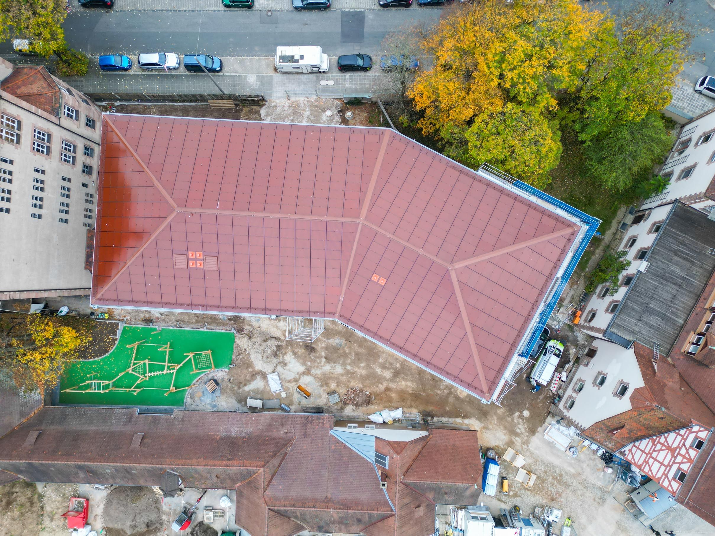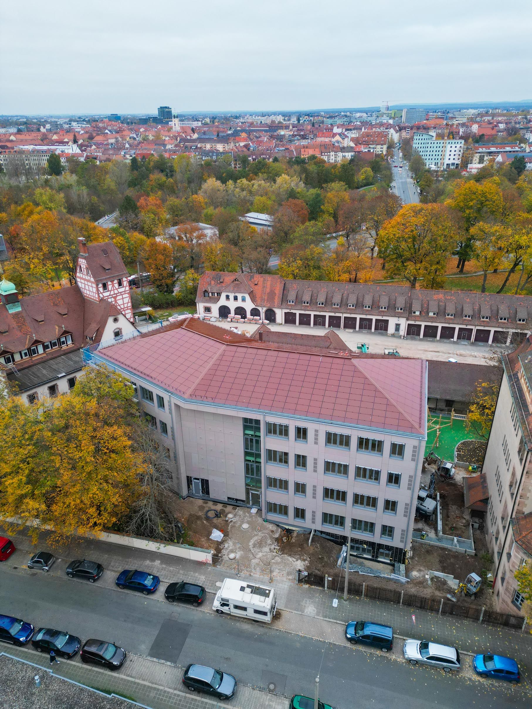 Der Erweiterungsbau ist zwischen drei Einzeldenkmälern verortet: dem Hauptgebäude der Reutersbrunnenschule von 1909, dem Feuerwehrhaupthaus von 1900 und dem Schmiedewerkstattgebäude der Feuerwehr von 1902. Um das Solardach farblich in die Dachlandschaft einzuordnen, sind rote Photovoltaikmodule auf der gesamten Dachfläche verbaut. „Ein Indach-System ist die Alternative zum klassischen Aufdach-Montagesystem. Während bei letzterem die Solarmodule über den Dachziegeln installiert werden, bilden die Module der Indach-PV-Anlage die Dachhaut und fungieren neben der Stromerzeugung als wasserführende Schicht und schützen das Gebäude vor Witterungseinflüssen“, erklärt Planungs- und Baureferent Daniel F. Ulrich. maj