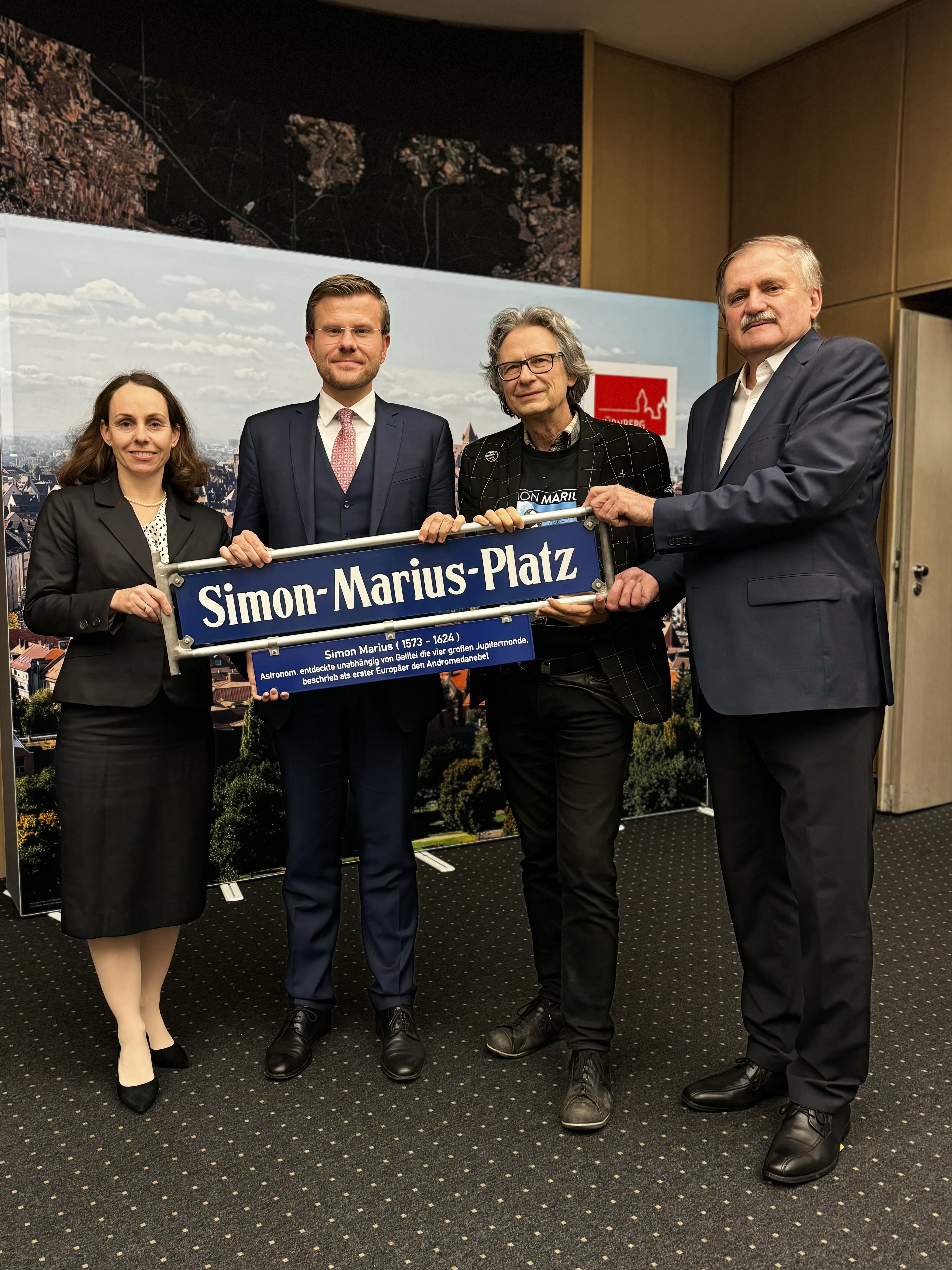 Die Stadt würdigt einen bedeutenden fränkischen Astronomen: Am Donnerstag, 14. November 2024, haben Oberbürgermeister Marcus König und Wirtschafts- und Wissenschaftsreferentin Dr. Andrea Heilmaier gemeinsam mit Pierre Leich, Präsident der Simon Marius Gesellschaft, und Dr. Dieter Hölzl, Präsident der Astronomischen Gesellschaft in der Metropolregion Nürnberg, ein Straßenschild zu Ehren von Simon Marius symbolisch übergeben.