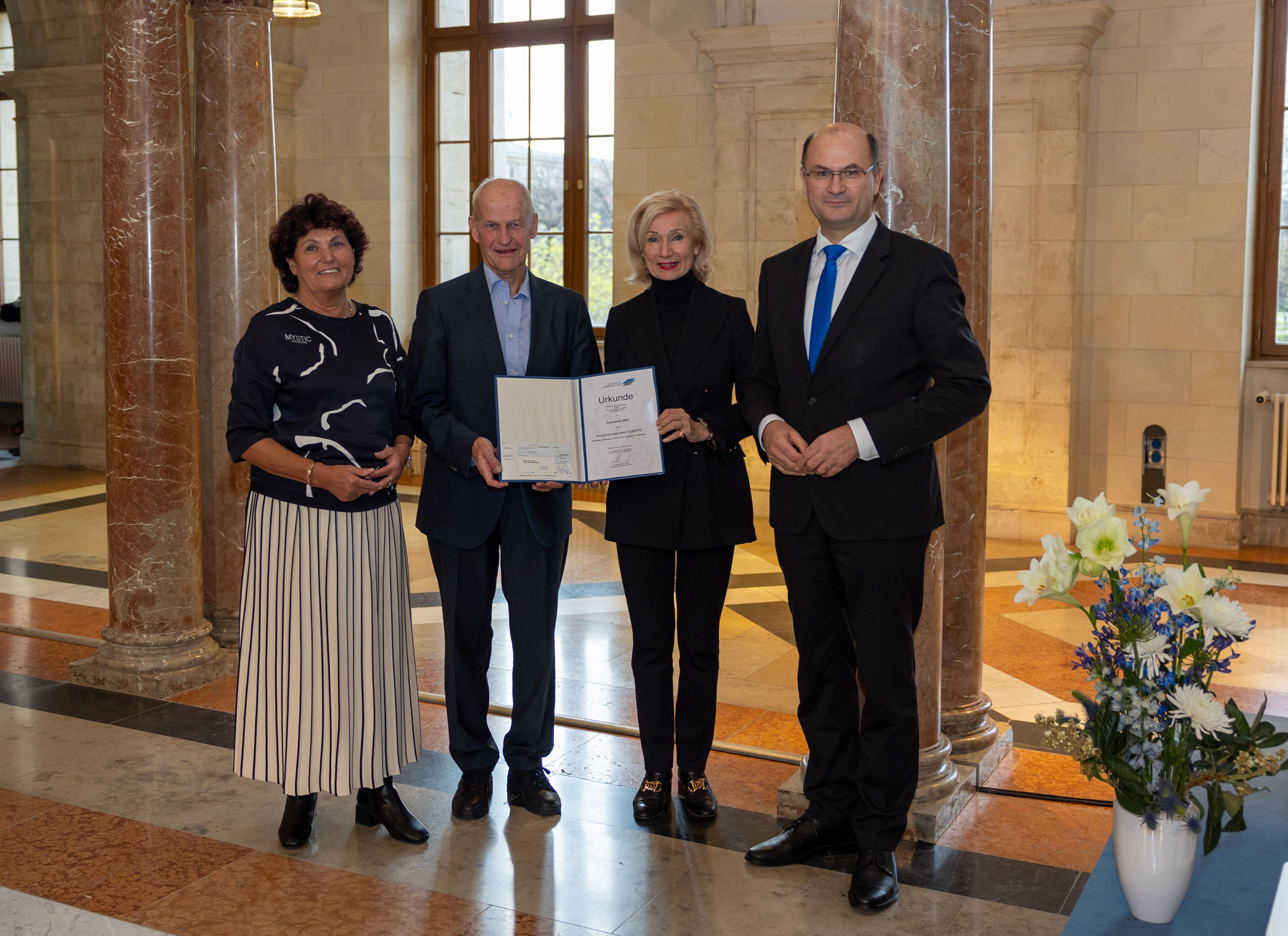 Kulturpreis der Bayerischen Landesstiftung für das Programm MUBIKIN (Musikalische Bildung für Kinder und Jugendliche in Nürnberg): Am Dienstag, 19. November 2024, haben Bürgermeisterin Prof. Dr. Julia Lehner und Helmut Gierse, Vorsitzender der MUBIKIN-Trägerversammlung, die Urkunde bei einem Festakt in der Bayerischen Staatskanzlei in München entgegengenommen. Die Auszeichnung überreichte Albert Füracker, Staatsminister für Heimat und Finanzen. Sie ist mit 10 000 Euro dotiert.