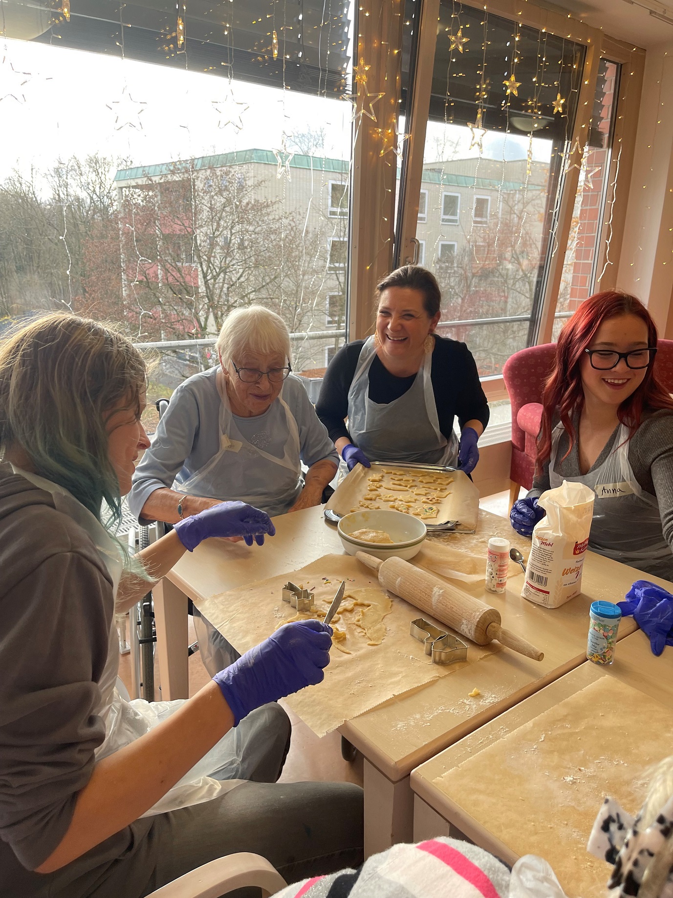 Während sich die Plätzchen im Ofen goldbraun färbten, vertieften sich die Jugendlichen in Gespräche mit den Seniorinnen und Senioren. Einige der älteren Damen und Herren erzählten von der Zeit, als sie selbst in jungen Jahren das Backen gelernt haben, andere tauschten Erinnerungen aus. Auch für die Schülerinnen und Schüler der 5. Klasse ist dies eine prägende Erfahrung: Sie lernen, wie wichtig es für die älteren Menschen ist, gerade mit Jugendlichen ins Gespräch zu kommen und ihre Erfahrungen und Erlebnisse zu teilen.
