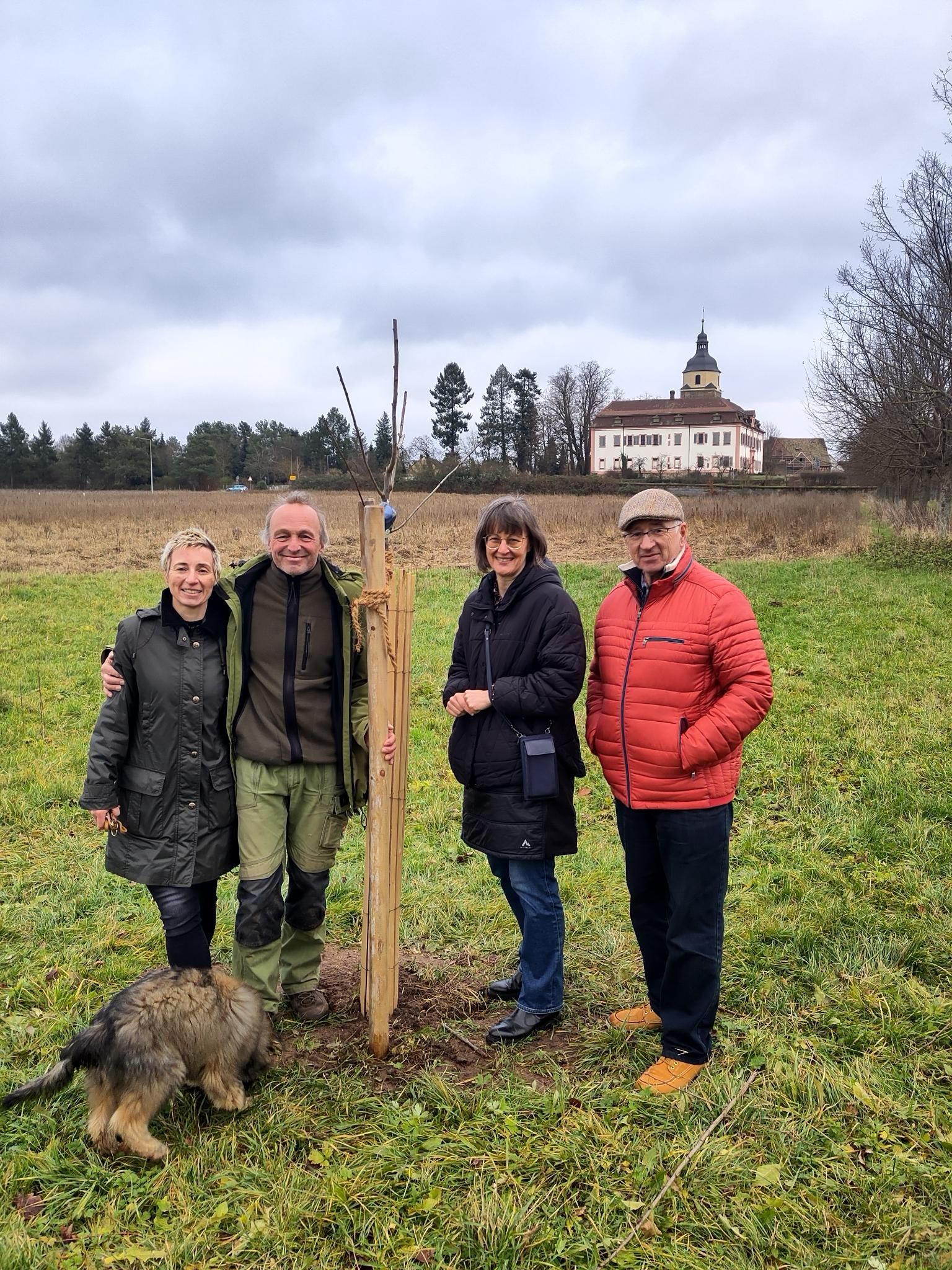 Seit Kurzem steht am Westrand von Großgründlach auf einer Länge von 480 Metern die längste Obstbaumallee in Nürnberg mit 48 Bäumen. Das Projekt geht auf die Initiative der Grundeigentümer Walter Popp und dessen Tochter Susanne Werner zurück, auf deren Fläche die Bäume stehen. Geplant, betreut und gepflegt werden die jungen Bäume vom Landschaftspflegeverband Nürnberg e. V. (LPV) und den Flächeneigentümern, die beim Pflanzen wie auch der künftigen Wässerung und Pflege der Bäume, unterstützen. Am Montag, 16. Dezember 2024, besuchte Britta Walthelm, erste Vorsitzende des LPV und Referentin für Umwelt und Gesundheit, zusammen mit weiteren LPV-Mitgliedern die Obstbäume.