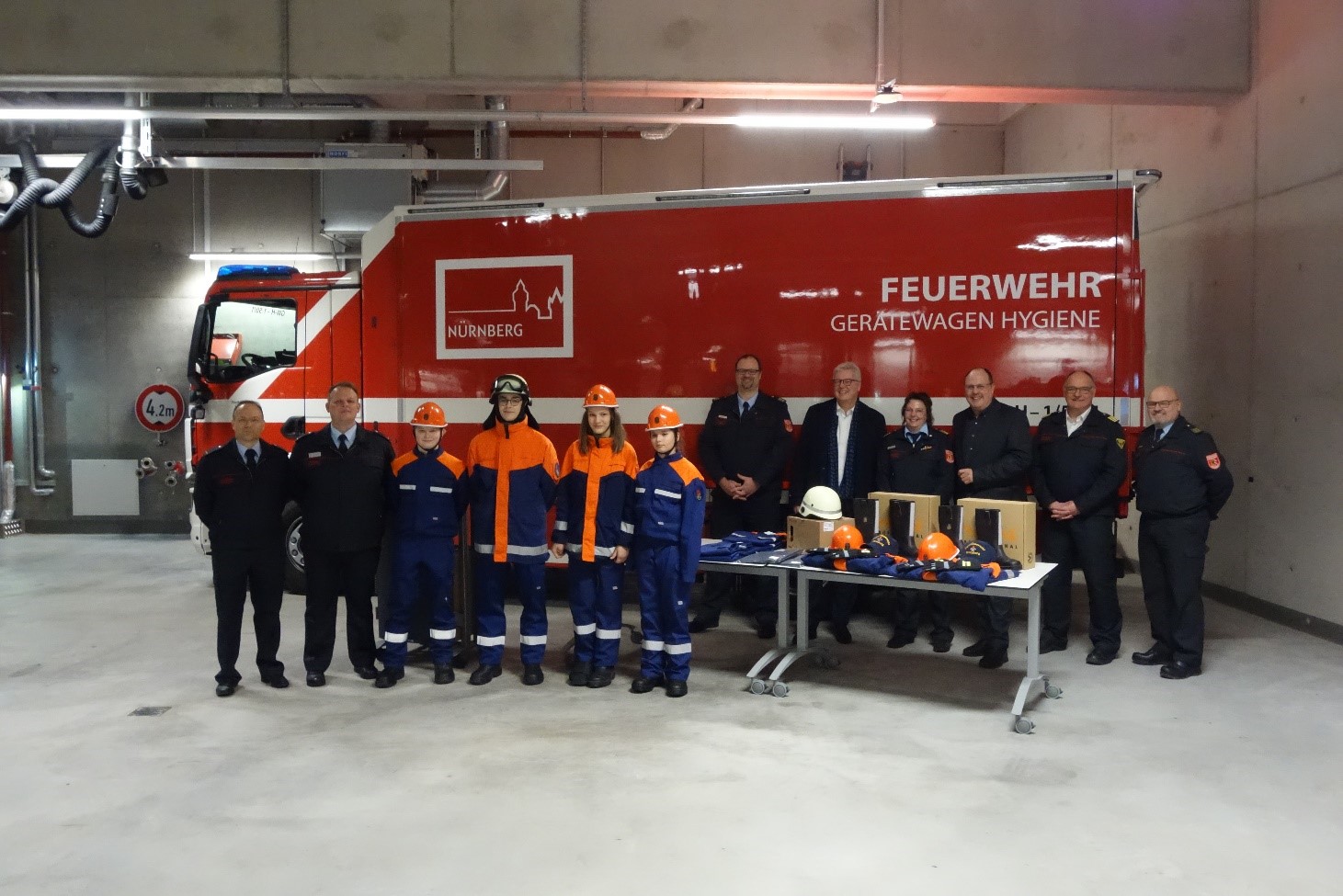 Anlässlich der Spendenübergabe kamen neben Mitgliedern der Jugendfeuerwehren und deren Stadtjugendwart Dirk Freiboth auch Bürgermeister Christian Vogel, der Leiter der Feuerwehr Nürnberg, Volker Skrok, Dr. Matthias Everding, Vorstandsvorsitzender der Zukunftsstiftung der Sparkasse Nürnberg und die Führung der Freiwilligen Feuerwehr um Stadtbrandrätin Claudia Herzog auf der Feuerwache 1 in die Reutersbrunnenstraße 63.