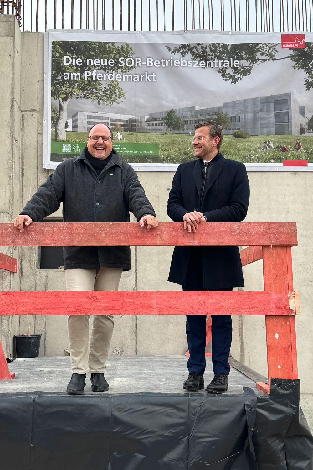 Die neue Zentrale des Servicebetriebs Öffentlicher Raum Nürnberg (Sör) am Pferdemarkt nimmt Gestalt an. Oberbürgermeister Marcus König sowie Bürgermeister und Erster Sör-Werkleiter Christian Vogel haben am Mittwoch, 5. Februar 2025, nach altem Brauch gemeinsam eine Zeitkapsel in den Gebäudesockel eingemauert. Die Zentrale ist zukünftig der größte und modernste Betriebshof der Stadt Nürnberg. Alle Sör-Werkstätten, viele Fahrzeuge und Mitarbeitende werden in einem funktionalen Neubau unterkommen, das sich weitgehend selbst mit Strom und Wärme versorgt. Die Arbeiten gehen zügig voran.