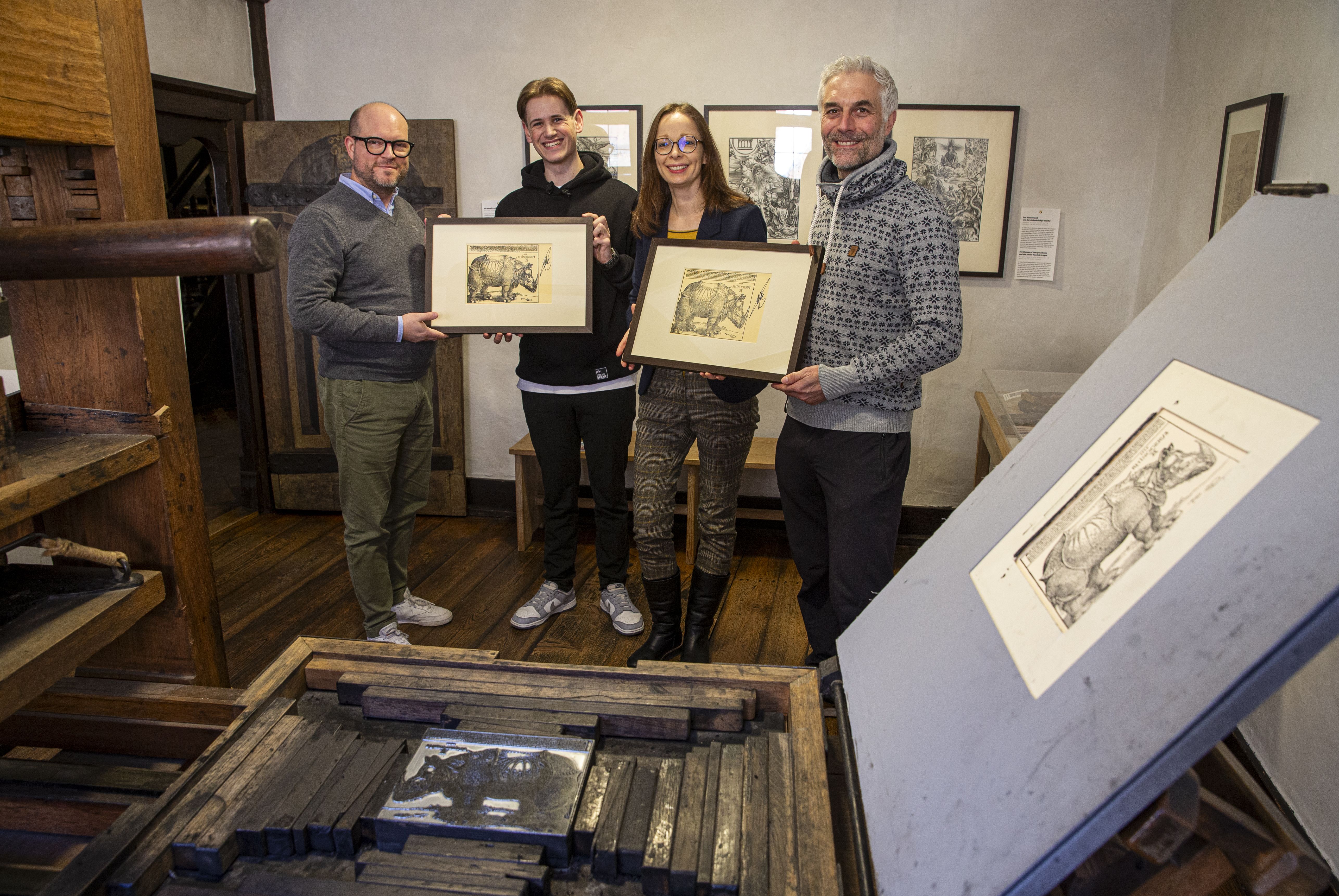 Zum neuen Jahr hat das Albrecht-Dürer-Haus sein Führungsprogramm erweitert. Um dies zu feiern, verloste das Museum acht attraktiv gerahmte Hochdrucke des „Rhinocerus“ nach Albrecht Dürer. Alle Personen, die im Januar 2025 eine Führung im Albrecht-Dürer-Haus besuchten, konnten an der Verlosung teilnehmen und ein Exemplar der limitierten Auflage gewinnen. Nun wurden die besonderen Drucke an die Gewinnerinnen und Gewinner überreicht.