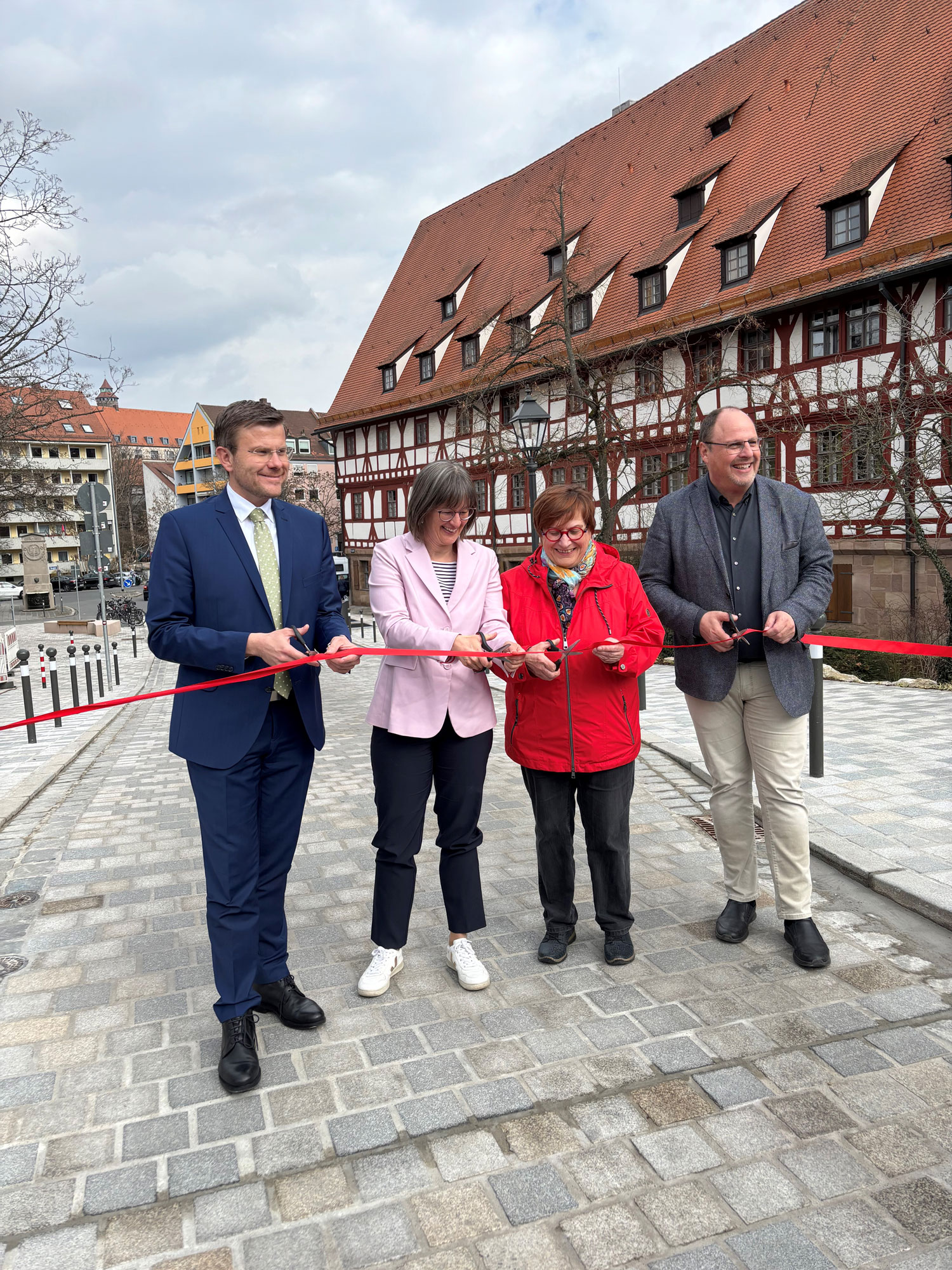 Die Stadt Nürnberg hat den dritten und letzten Bauabschnitt des Nägeleinsplatzes in der Nürnberger Altstadt fertiggestellt. Nach der vorangegangenen Öffnung des Ufers zur Pegnitz im Bereich Kettensteg / Hallertürlein und Henkersteg wurde nun die Karlstraße erneuert und mit fünf neuen Bäumen begrünt sowie der Maxplatz umfassend umgestaltet. Oberbürgermeister Marcus König, Bürgermeister und Erster Werkleiter des Servicebetriebs Öffentlicher Raum Nürnberg (Sör), Christian Vogel, sowie die Referentin für Umwelt und Gesundheit, Britta Walthelm, übergaben am Dienstag, 11. März 2025, das Areal rund um den Maxplatz sowie die Karlstraße der Öffentlichkeit.