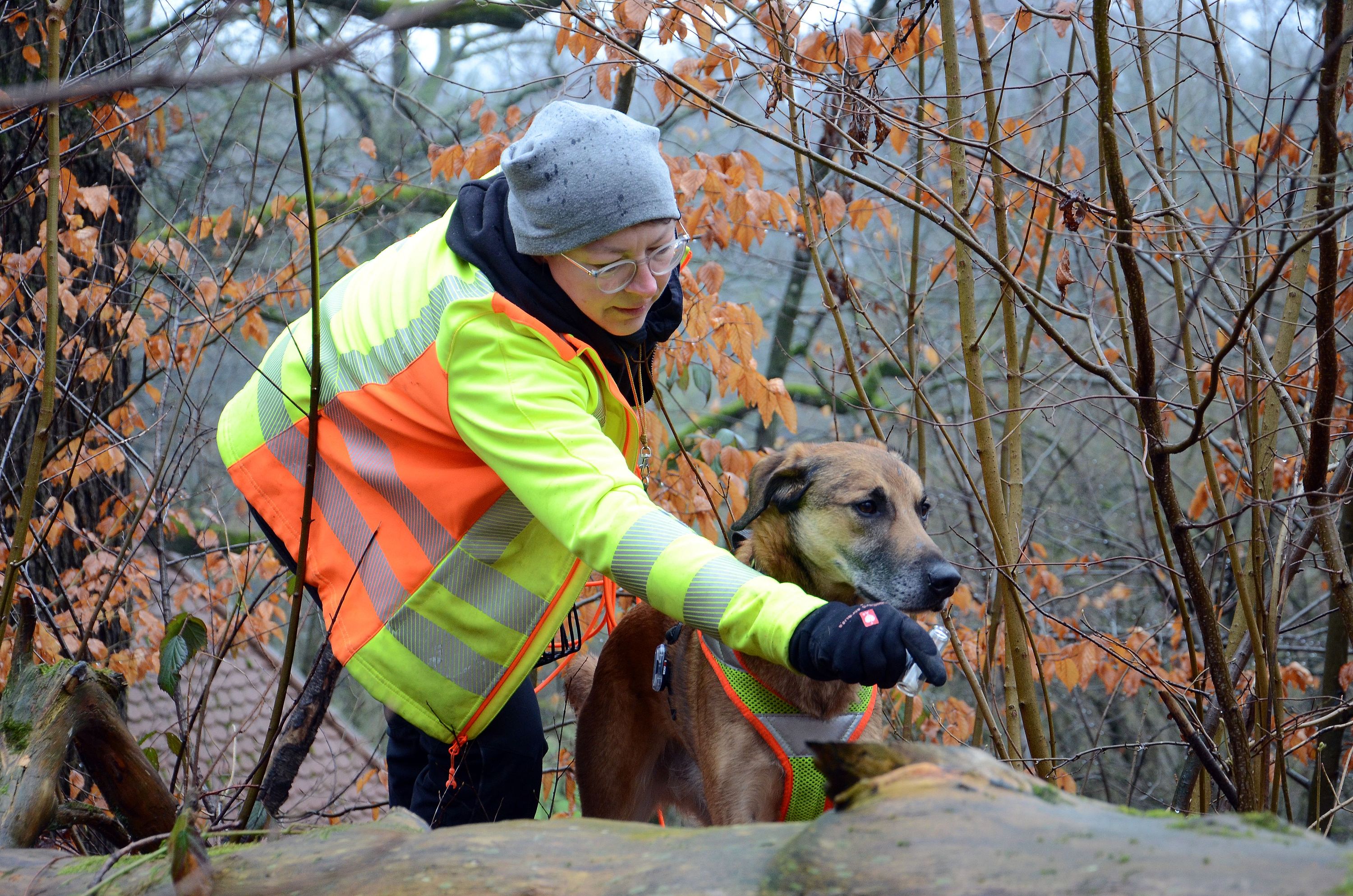 Bei der Erhebung im Tiergarten kam erstmals auch ein Artenspürhund zum Einsatz. Er wurde mit Duftproben von Eremiten-Larven konfrontiert und spürte dann Bäume auf, in denen potenziell Eremiten vorkommen. Begleitet wurde der Hund von Rena Siegerist. Die Fachagrarwirtin für Baumpflege und Baumsanierung hat sich mit ihrem Geschäftszweig „Baum und Nase“ auf die Arbeit mit sogenannten Pathogenspürhunden spezialisiert. Der fast siebenjährige „Ip“, ein erfahrener Malinois-Dobermann-Mix, hat einen hochentwickelten Geruchssinn und kann Gerüche präzise differenzieren. Auf diese Weise ist er in der Lage, Schaderreger frühzeitig zu erkennen oder – wie in diesem Fall – seltene Arten aufzuspüren.