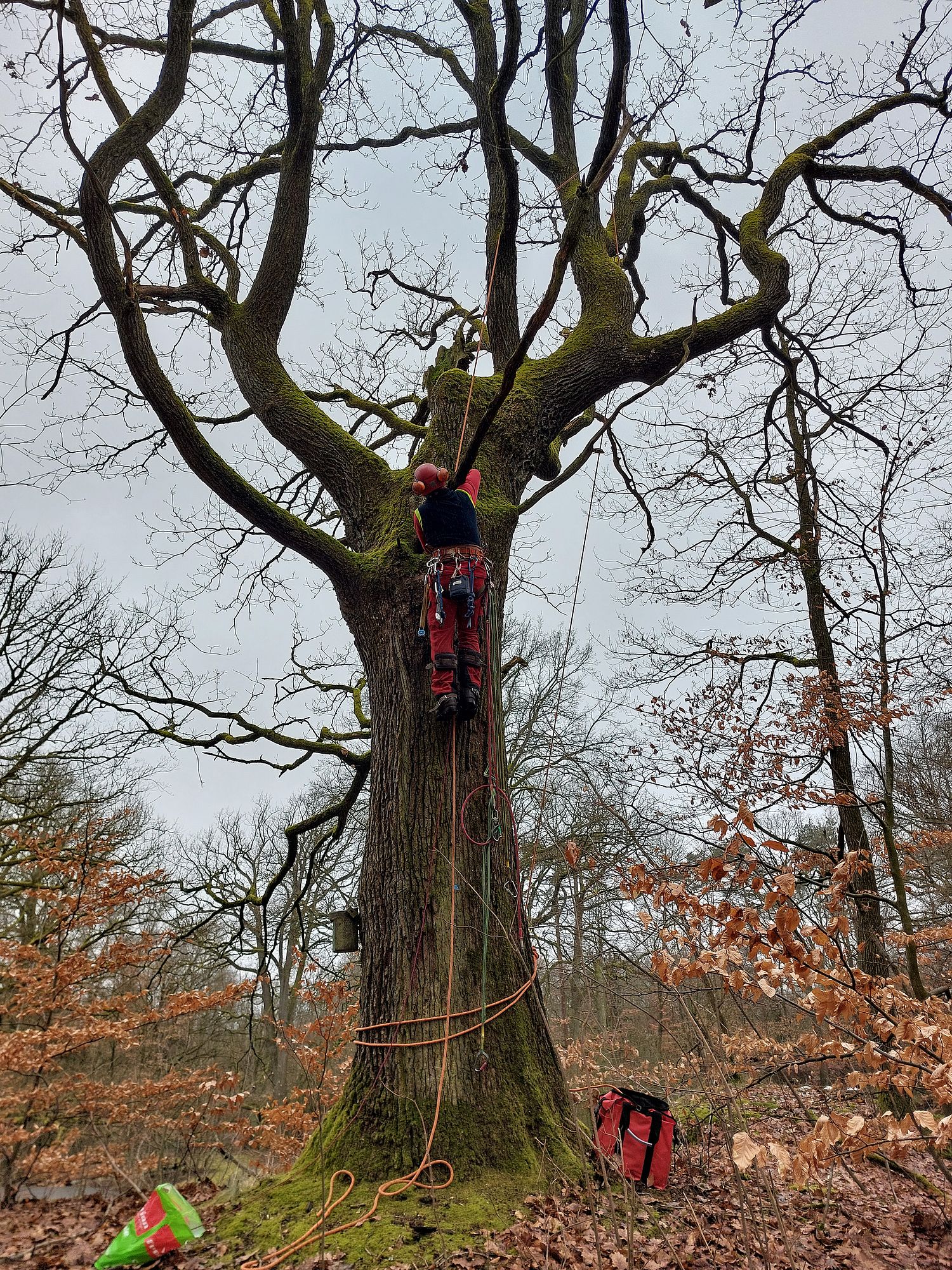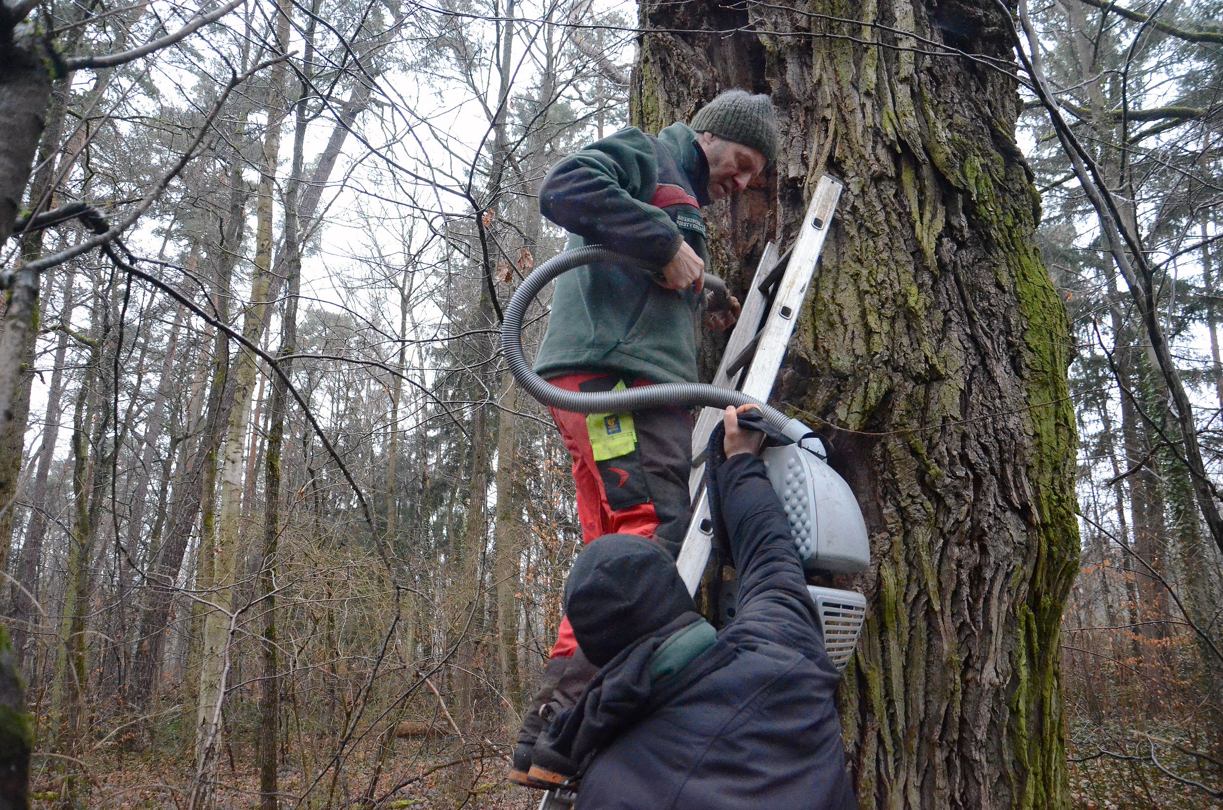 An zwei Einsatztagen Mitte Februar hat Ip im und um den Tiergarten bei insgesamt 21 Eichen angeschlagen. Eine Woche darauf war die LWF mit zwei Baumkletterern und Mitarbeitern der Ämter für Ernährung, Landwirtschaft und Forsten Coburg-Kulmbach, Bamberg und Ansbach vor Ort. Sie begutachteten die identifizierten Bäume und kletterten wo möglich zu den Höhlen, in denen der Eremit vorkommen könnte. Mit einem speziellen Staubsauger saugten sie den Mulm vorsichtig aus der Höhle und ließen ihn anschließend durch ein Sieb rieseln. Das zurückgebliebene Material untersuchten sie auf Larven, Kotpellets oder Teile des Chitin-Panzers.