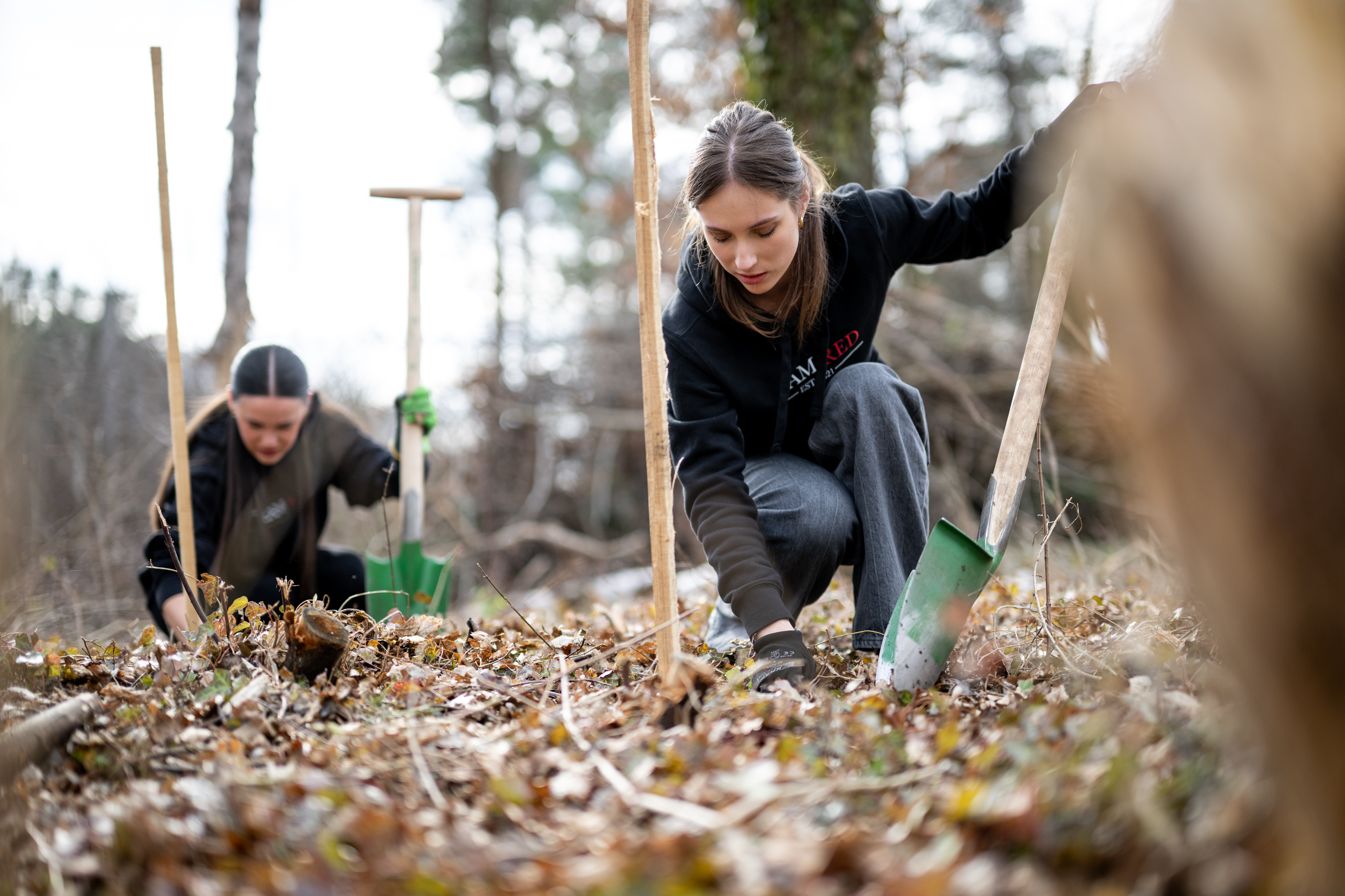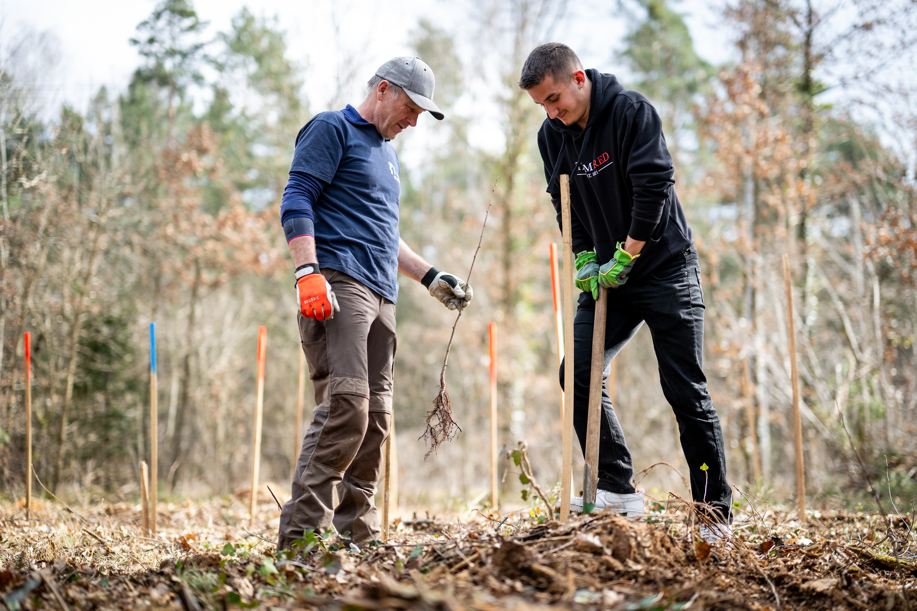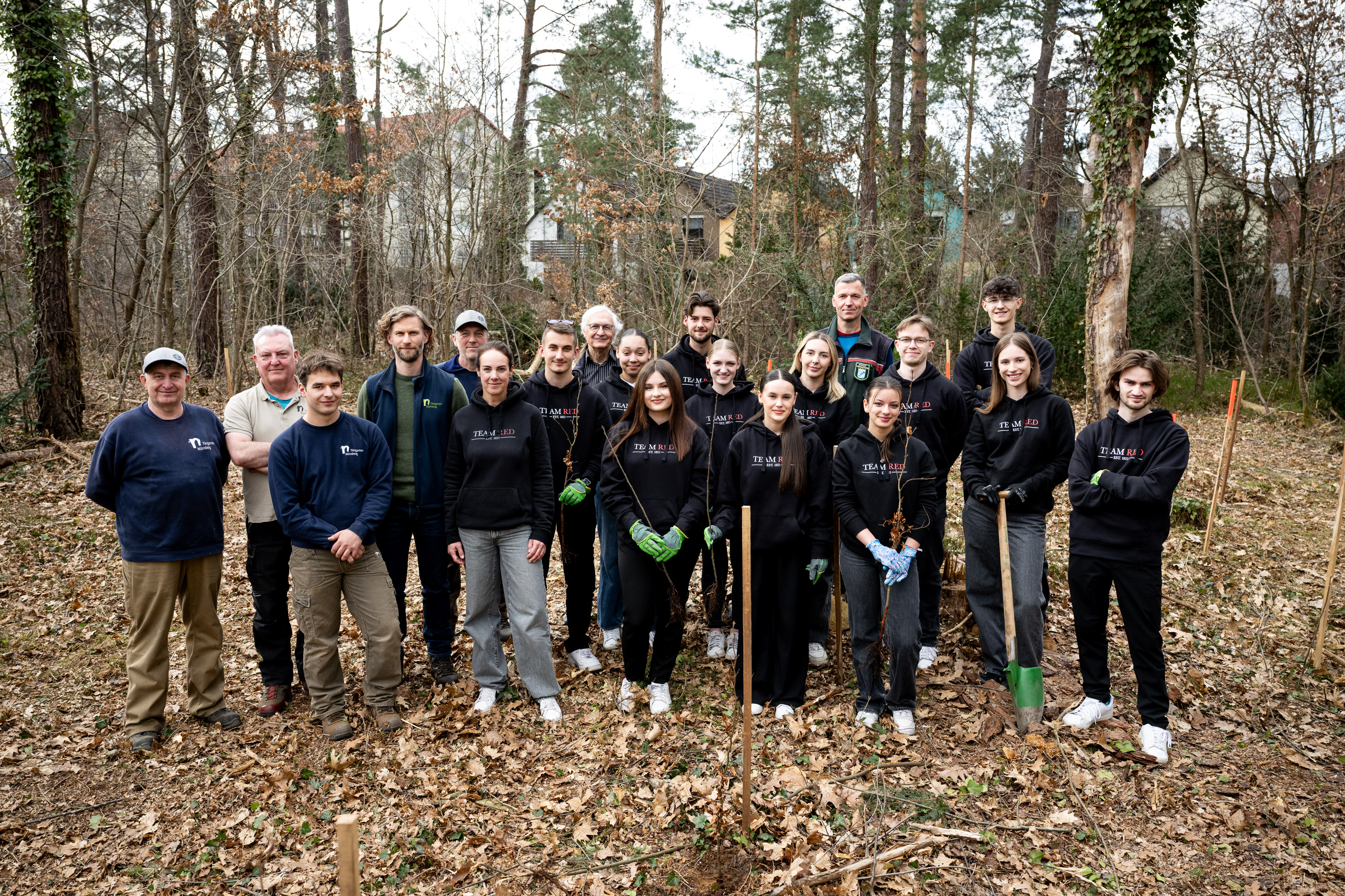 Die Auszubildenden der Sparkasse Nürnberg pflanzten dabei gemeinsam mit den Fachleuten des Tiergartens und des AELF 132 Bäume, verteilt auf vier Nelderräder. Das Pflanzschema des Nelderrads ist eine Methode, neue, klimaresistente Baumarten in bestehende Wälder zu integrieren. Es folgt der Form eines Rads und hat einen Durchmesser von etwa 14 Metern. Auf dieser Fläche werden auf sparsame und dennoch effektive Weise 33 Setzlinge verteilt. So eignet sich das Schema besonders für die Bepflanzung kleiner Waldflächen. Zum Einsatz kamen dabei sechs verschiedene Baumarten: Darunter heimische Arten wie Hainbuche, Rotbuche, Winter- und Sommerlinde sowie Arten, die noch nicht heimisch, aber gut für künftige Klimaextreme gerüstet sind, so zum Beispiel Edelkastanien und Zerreichen. Die neu gepflanzten Bäume ergänzen die bereits in dem Waldstück vorhandenen Arten wie die Eichen, die von selbst aufgegangen sind.