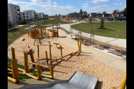Zwischen weitläufigen, offenen Rasenflächen, Absenkungen für die Wasserversickerung und Aufschüttungen von Hügeln entstanden abwechslungsreiche Räume, die immer neue Blickbeziehungen eröffnen. Der vorhandene Bodenaushub wurde hierbei weitgehend wiederverwendet und für die Geländemodellierung in den Spielplatzflächen in Form von bespielbaren Hügeln genutzt. So wurden auch die Wünsche von Kindern und Anwohnenden nach Sicht- und Lärmschutz sowie Sicherheitsaspekte in der Planung berücksichtigt.