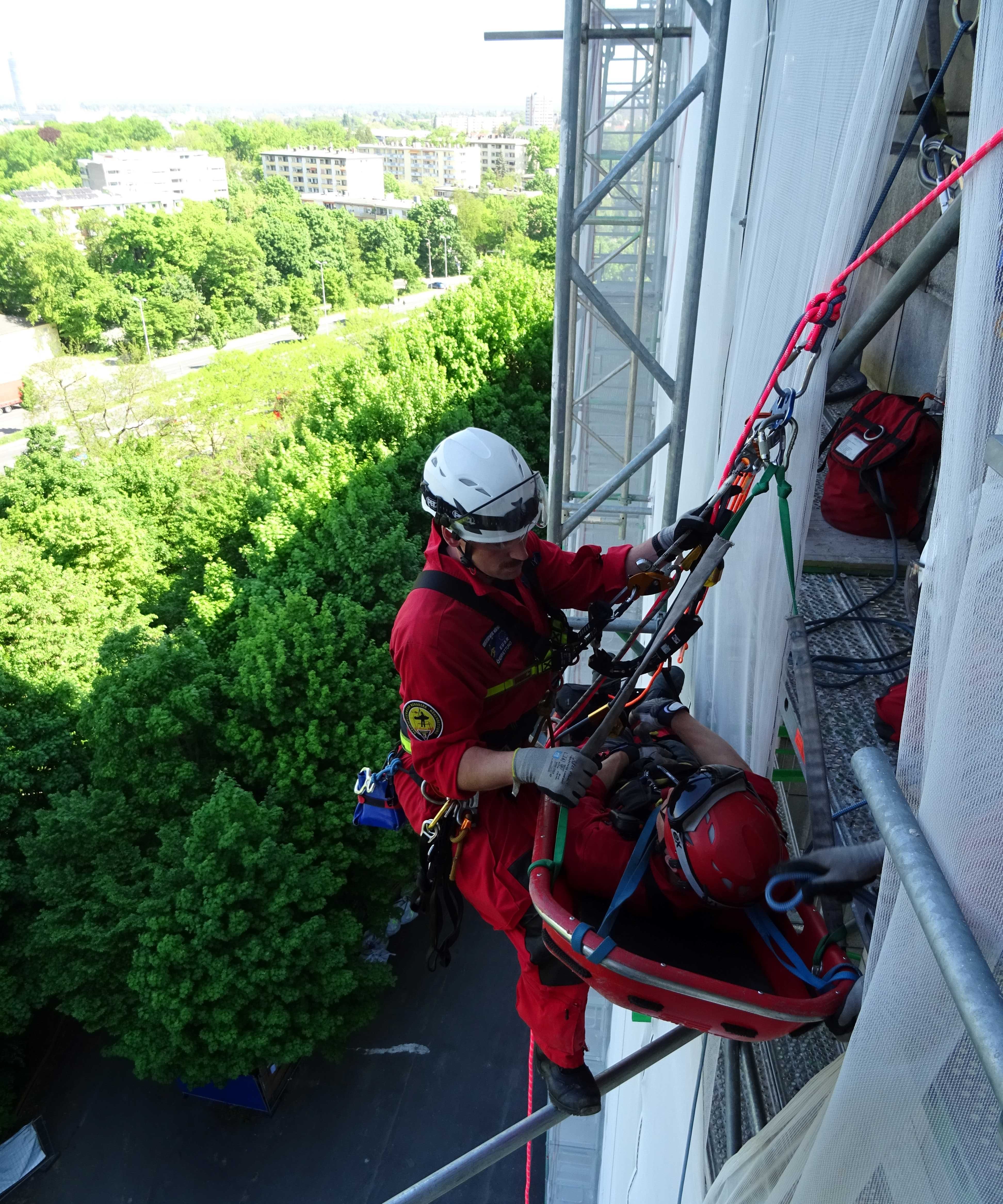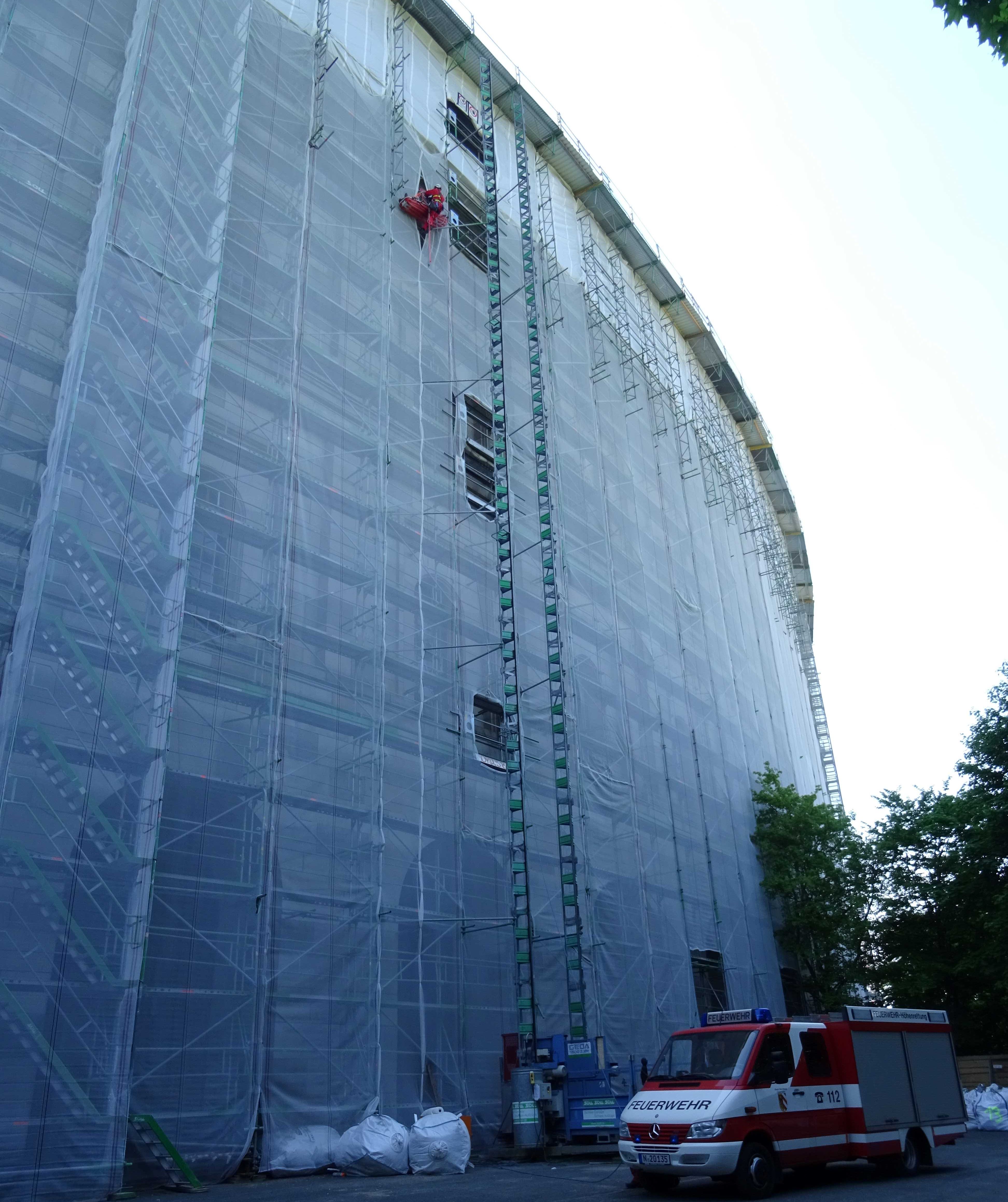 Am Freitag, 2. Mai 2025, hat die Berufsfeuerwehr Nürnberg, Feuerwache 2, Höhenrettung, an der Kongresshalle eine Höhenrettungsübung durchgeführt. Zum Einsatz kam ein Gerätewagen für die Höhenrettung mit fünf Höhenrettern. Mehrere Rettungsszenarien wie etwa die Rettung eines verletzten Arbeiters vom Gerüst, dem Dach oder aus einer Baugrube wurden geübt.
