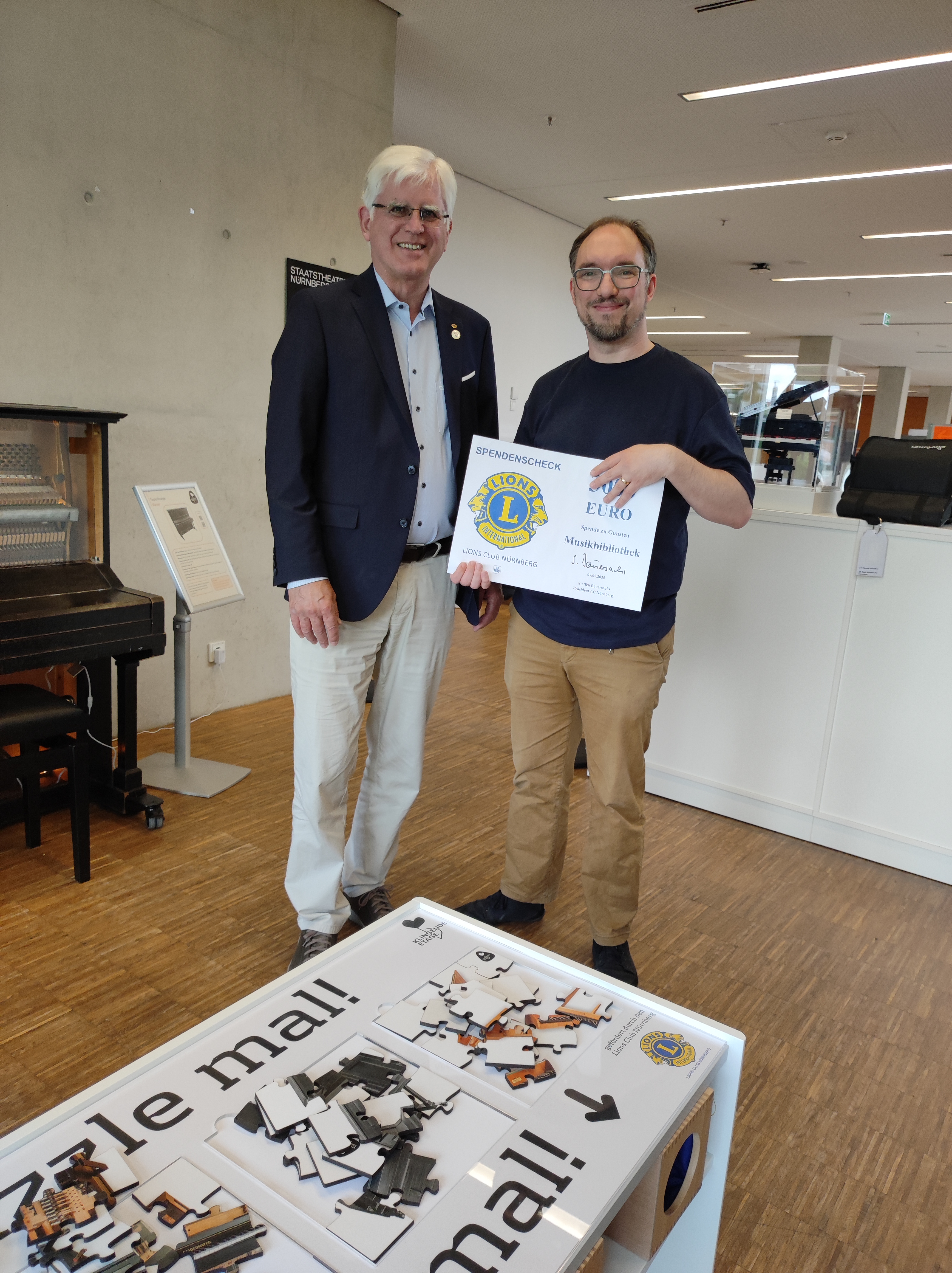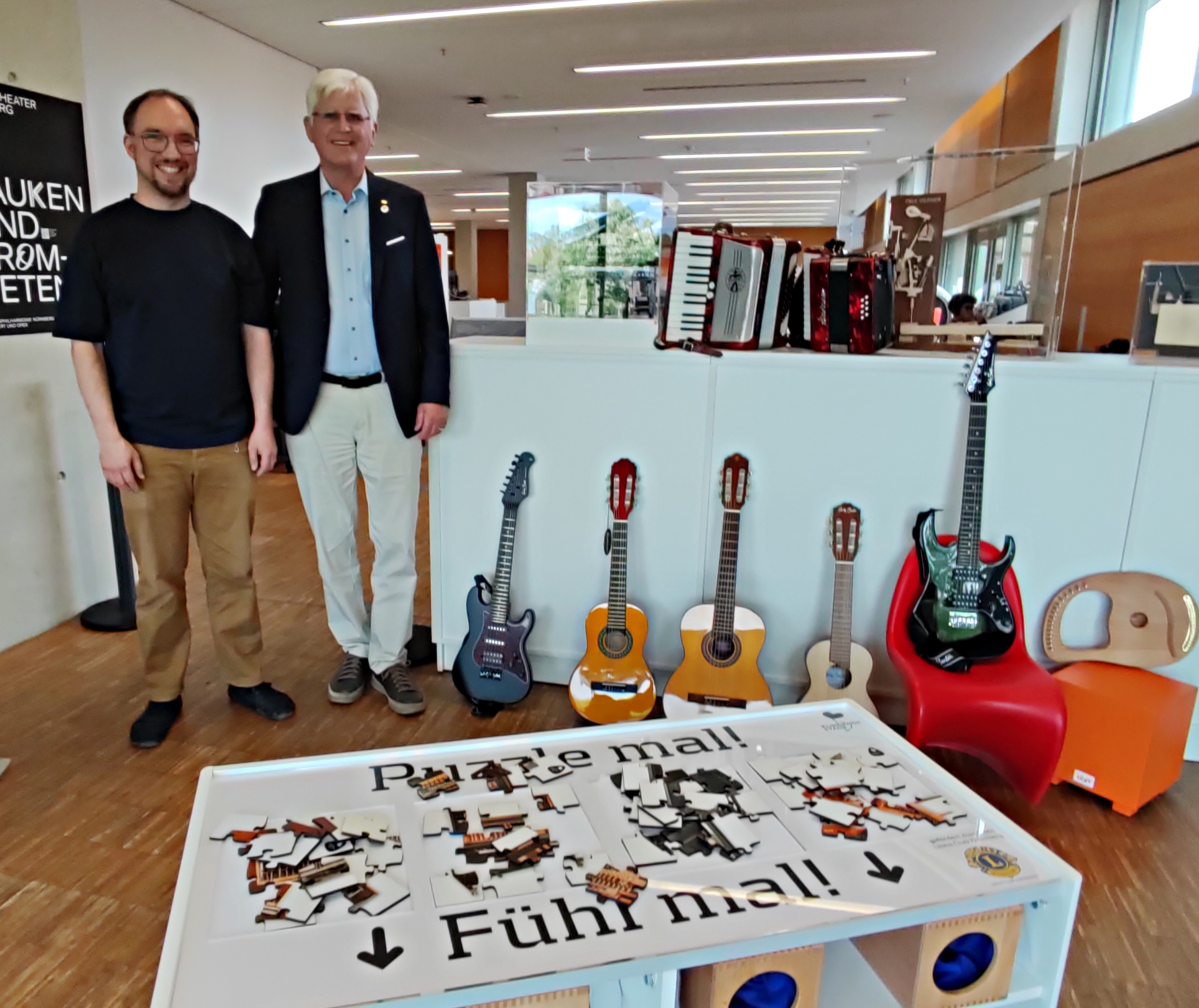 Durch eine Spende des Lions Clubs Nürnberg konnte die Musikbibliothek in der Stadtbibliothek, Gewerbemuseumsplatz 4, zehn Instrumente speziell für Kinder anschaffen. Neben Akustik- und E-Gitarren in verschiedenen Größen stehen ab sofort auch ein Kinder- und ein Juniorakkordeon sowie eine Harfenleier zur Verfügung. Außerdem wurde mit der Spende ein Spieltisch für Kinder in der Tastenlounge eingerichtet mit Puzzeln und „Fühl-Boxen“ zum Ertasten und Erraten einzelner Instrumentenbauteile. Die Instrumente und Angebote stehen – wie die gesamte Klingende Etage – vor Ort kostenlos zur Verfügung.