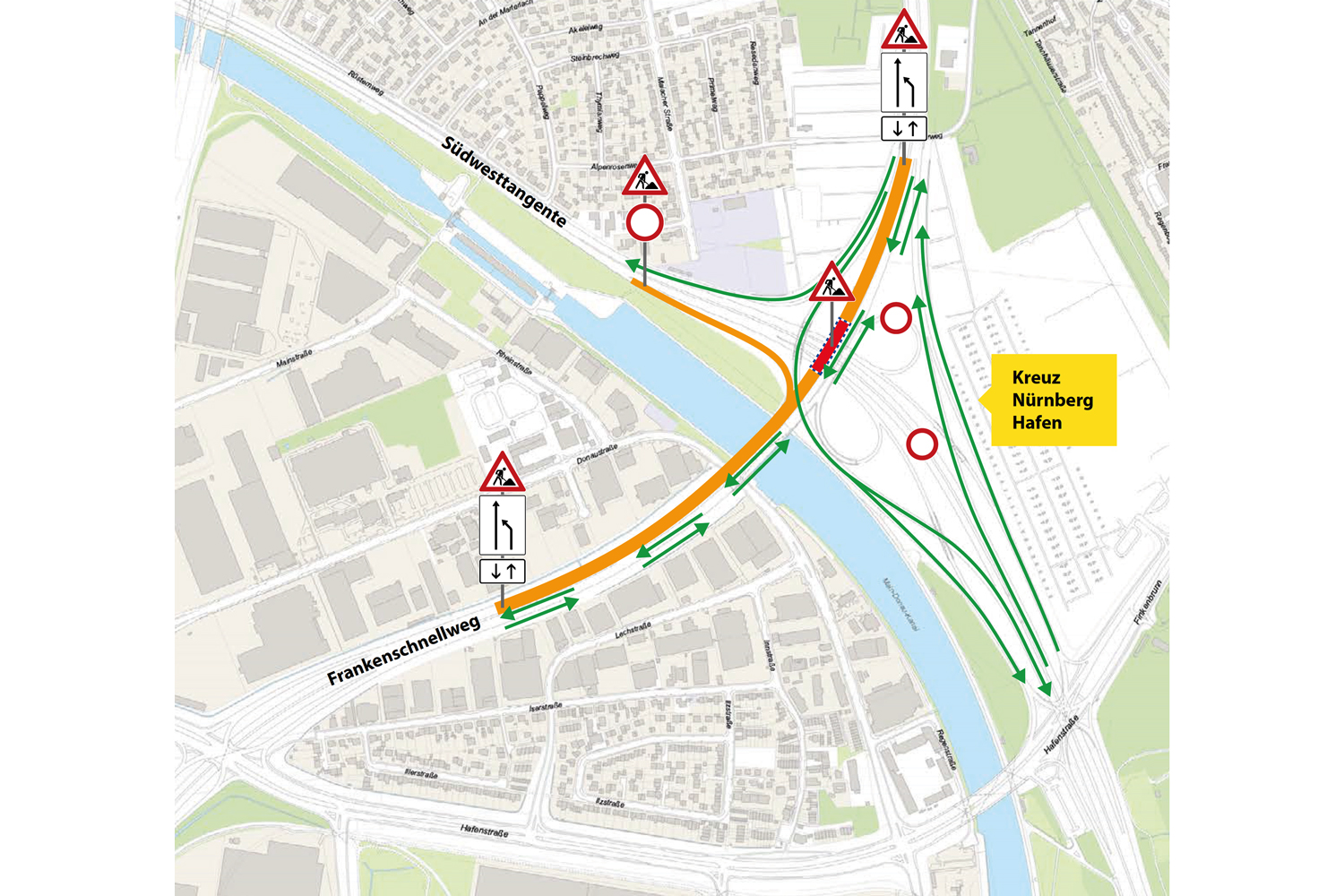 Die Südwesttangente am Kreuz Nürnberg-Hafen ist von Freitag, 16. Mai 2025, von 20 Uhr bis Montag, 19. Mai, um 5 Uhr voll gesperrt. Während dieser Zeit lässt der Servicebetrieb Öffentlicher Raum Nürnberg (Sör) den nördlichen Abschnitt der Frankenschnellwegbrücke abbrechen.