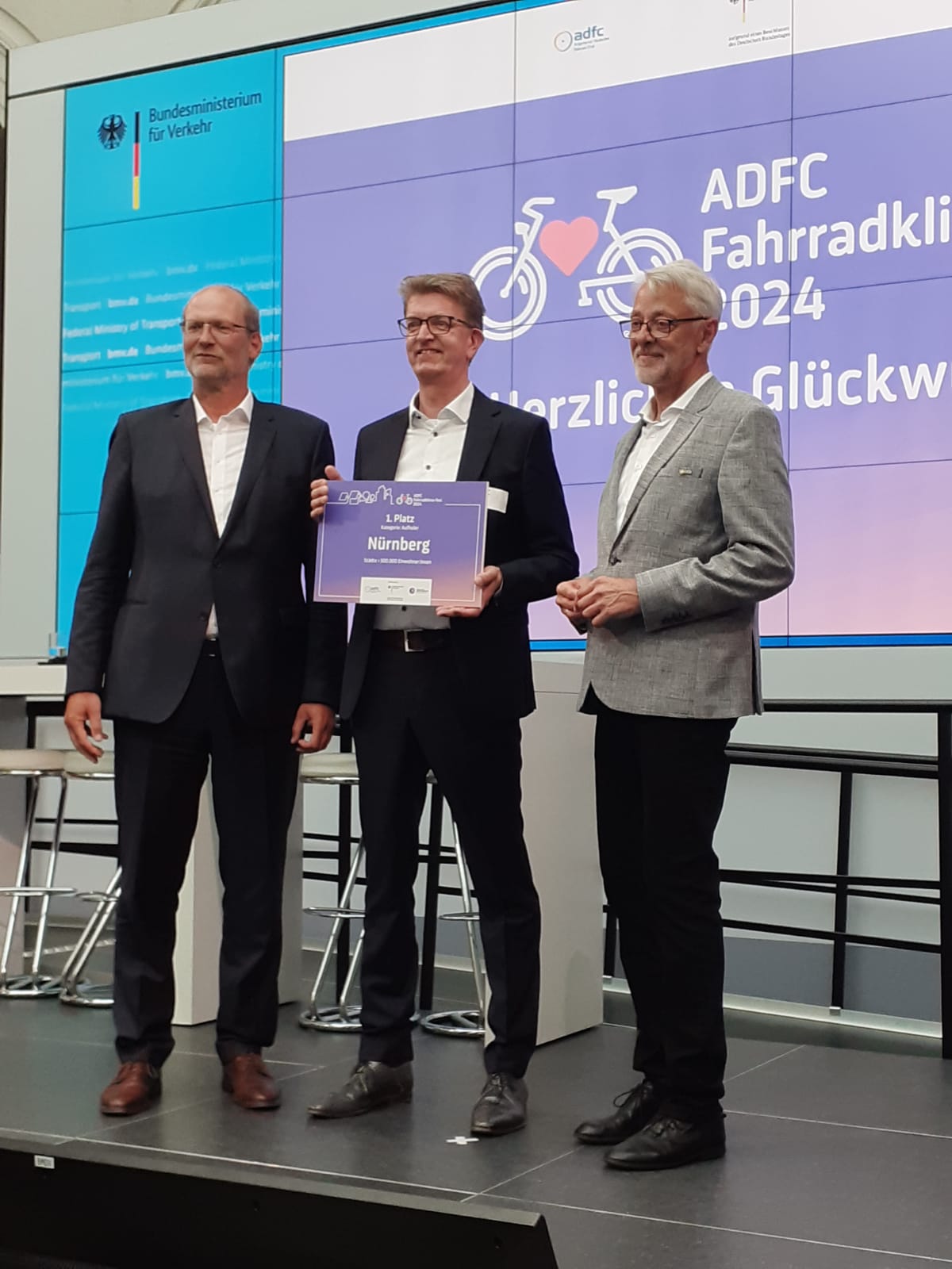 Die Stadt Nürnberg ist erstmals beim „ADFC-Fahrradklima-Test“ in der Kategorie „Aufholer“ für spürbare Verbesserungen im Radverkehr ausgezeichnet worden. Bundesverkehrsminister Patrick Schnieder hat am Dienstag, 17. Juni 2025, in Berlin die fahrradfreundlichsten Kommunen Deutschlands geehrt. Der Test, der alle zwei Jahre vom Allgemeinen Deutschen Fahrrad-Club (ADFC) durchgeführt wird, feiert 2024 seine elfte Auflage und dient als bundesweites Stimmungsbarometer für den Radverkehr.