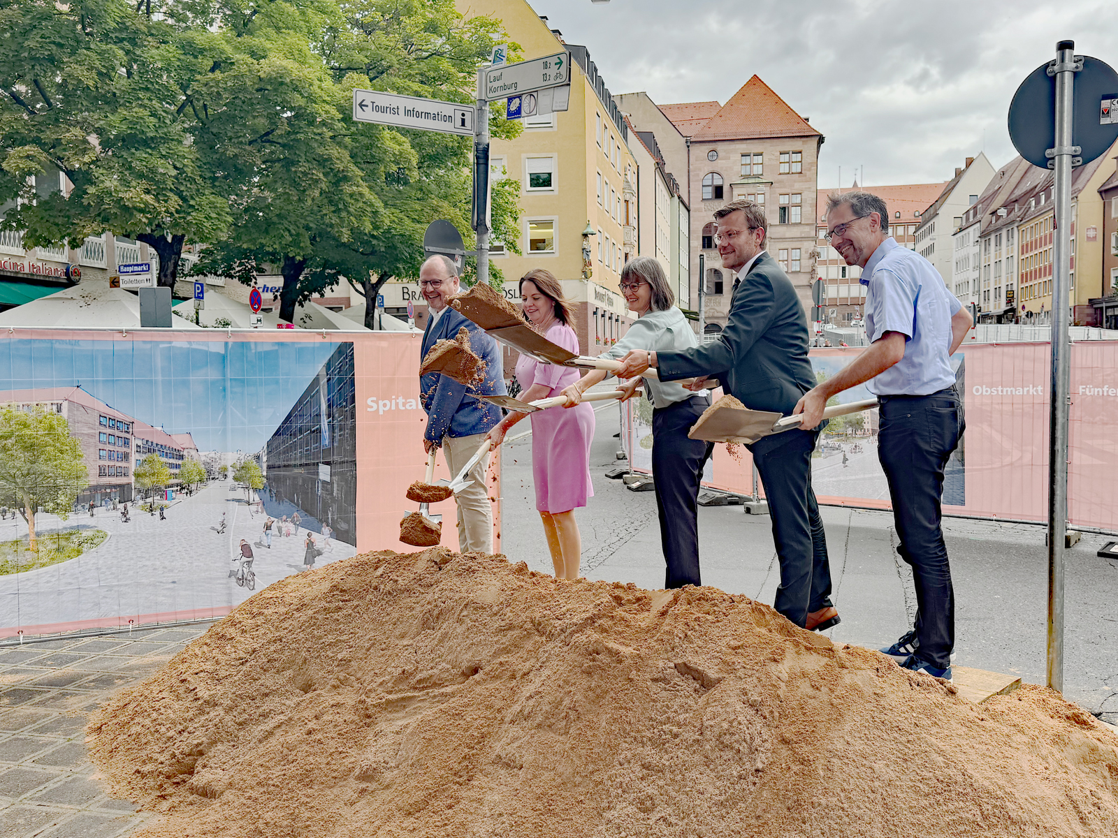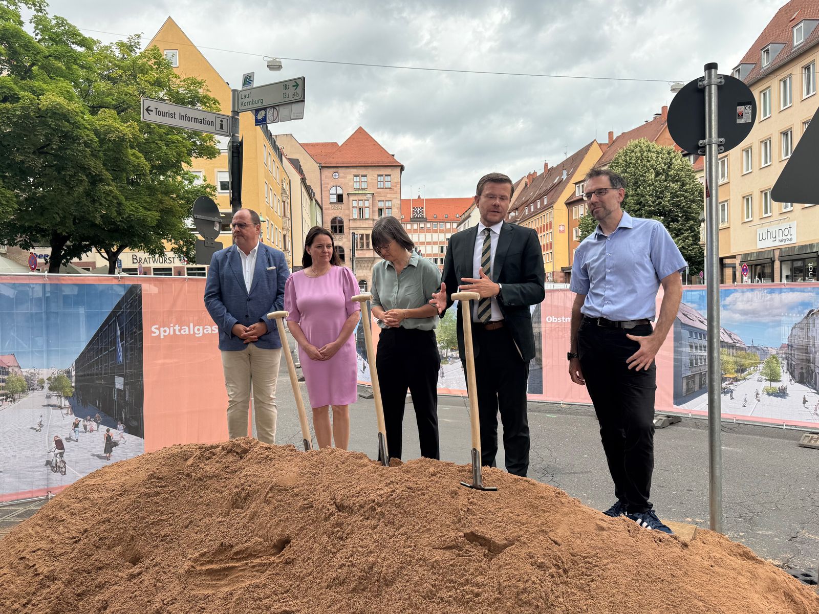 Der Obstmarkt im Zentrum der Nürnberger Altstadt wird grundlegend umgestaltet. Mehr Grün und ein neues Verkehrskonzept bringen zwischen Theresienstraße und Spitalgasse mehr Aufenthaltsqualität. Am Freitag, 27. Juni 2025, hat Oberbürgermeister Marcus König gemeinsam mit Christian Vogel, Bürgermeister und Erster Werkleiter des Servicebetriebs Öffentlicher Raum Nürnberg (Sör), sowie Planungs- und Baureferent Daniel F. Ulrich den symbolischen ersten Spatenstich für diese Umgestaltung vorgenommen.