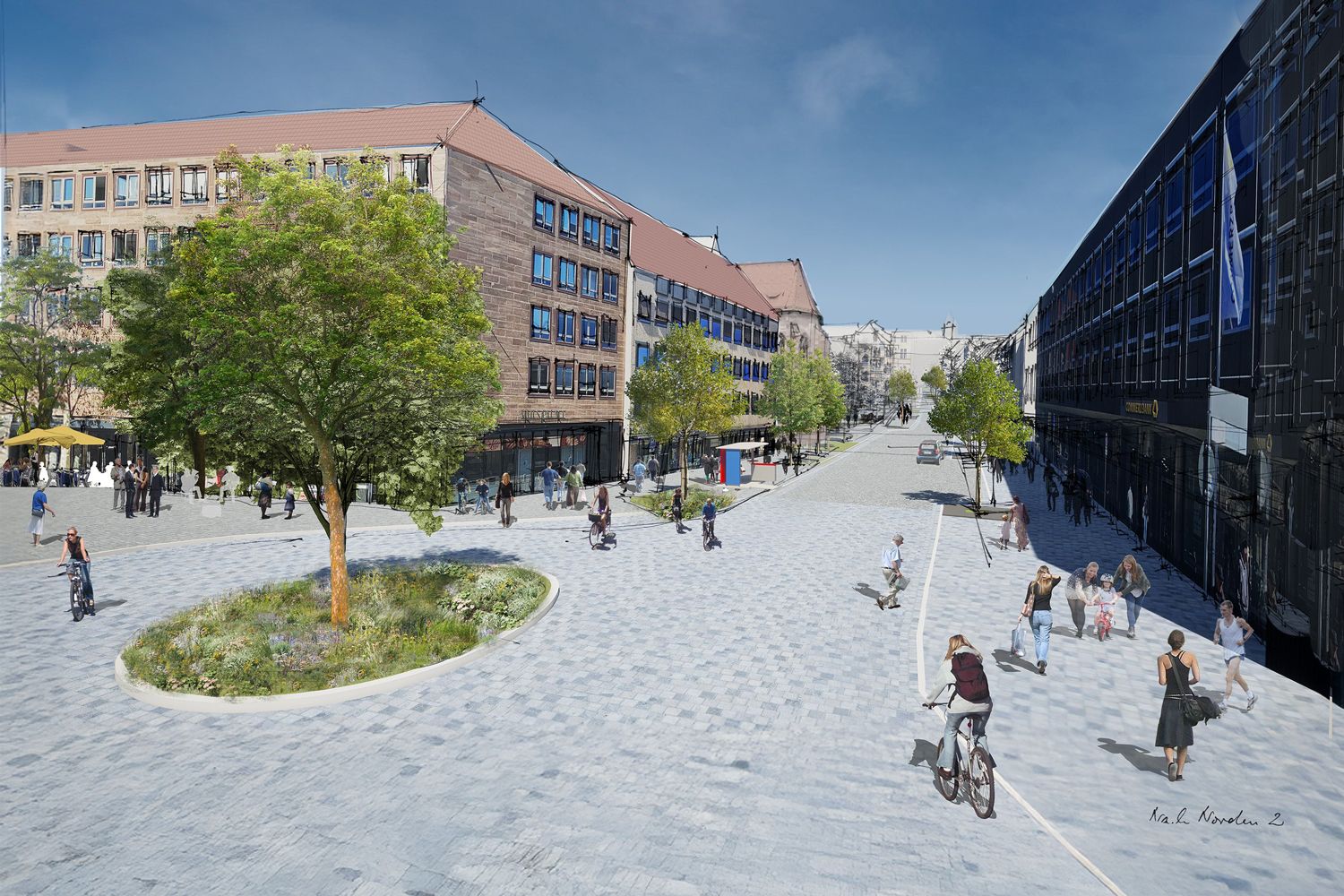 Oberbürgermeister Marcus König gibt einen Ausblick: „Was heute noch eine breite, graue Straße ist, gestalten wir neu zu einem Platz mit hoher Aufenthaltsqualität, der Menschen verbindet und durch Bäume, Schattenplätze, Wasser und Raum zum Verweilen einlädt. Wir schaffen hier nicht nur einen schöneren Ort, sondern machen Nürnberg fit für die Zukunft: mit breiten Gehwegen, viel Grün und Aufenthaltszonen. Mit weniger Asphalt, mehr Bäumen, Wasserflächen und einem neuen Regenwassersystem. Mit weniger Verkehr und mehr Lebensqualität. Und mit Raum für Kunst, Geschichte und Begegnung.“