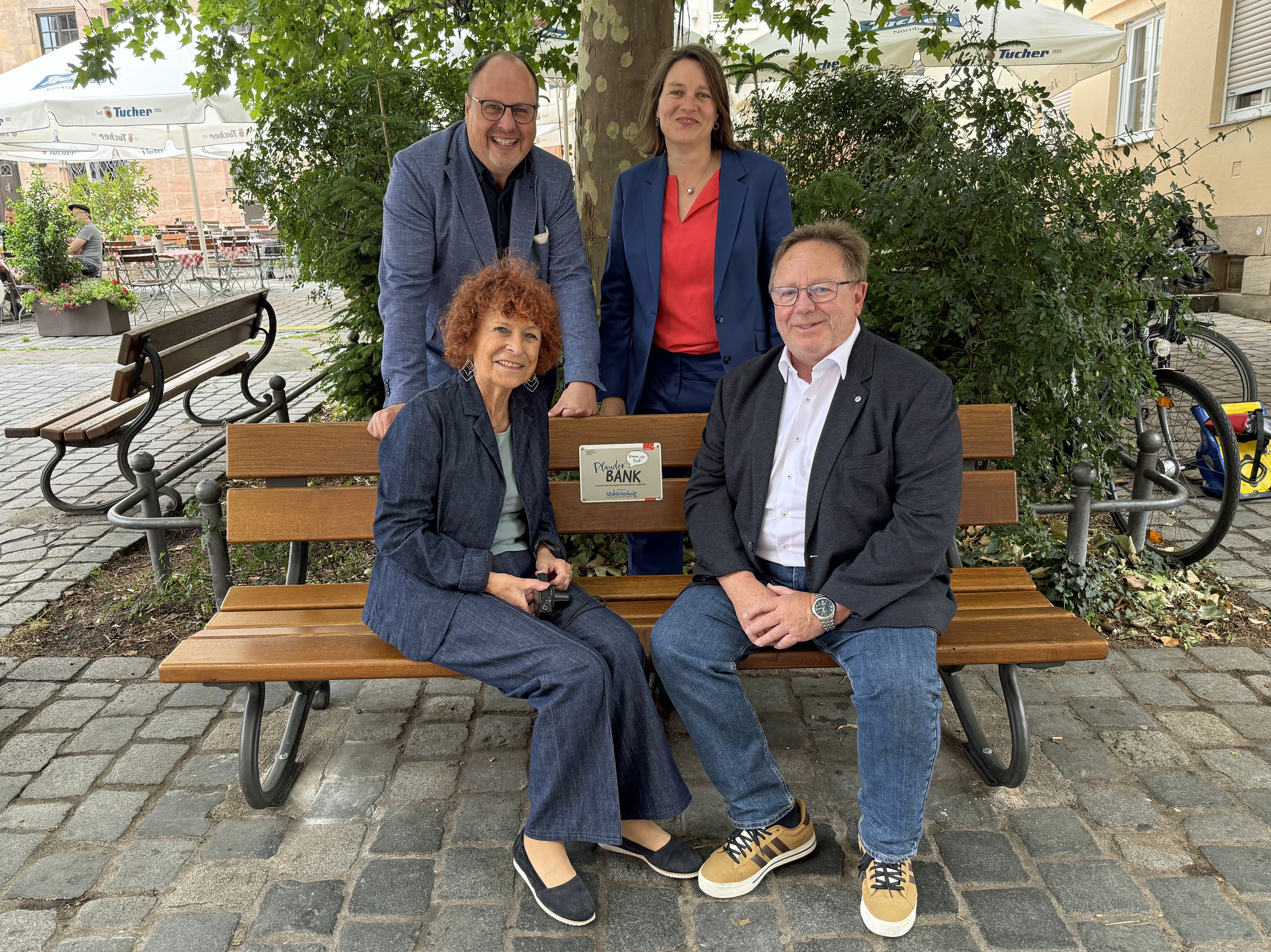 Nürnbergs erste offizielle Plauderbank steht am Sebalder Platz: Am Donnerstag, 17. Juli 2025, hat Christian Vogel, Bürgermeister und Erster Werkleiter des Servicebetriebs Öffentlicher Raum Nürnberg (Sör), gemeinsam mit Sozialrefentin Elisabeth Ries und Georg Reif, dem Vorsitzenden des Vereins „Seniorenmagazin sechs+sechzig – Verein zur Förderung des Dialogs der Generationen e. V.“, sowie der Stadträtin und stellvertretenden Vereinsvorsitzenden Gabriele Penzkofer-Röhrl die Sitzbank der Öffentlichkeit übergeben.