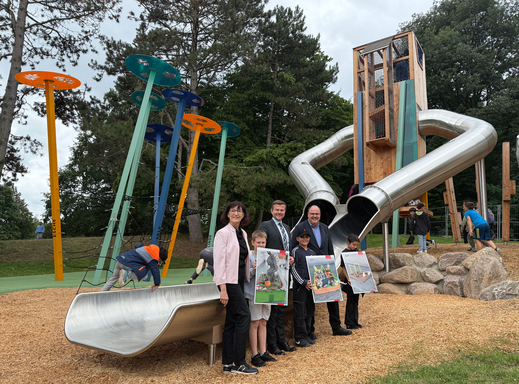 Bei der Umgestaltung der Grünanlage Ferdinand-Drexler-Weg hat der Servicebetrieb Öffentlicher Raum Nürnberg (Sör) einen rund 4 500 Quadratmeter großen, inklusiven Kinderspielplatz fertiggestellt. Am Montag, 28. Juli 2025, haben Oberbürgermeister Marcus König sowie Bürgermeister und Erster Sör-Werkleiter Christian Vogel den Kinderspielplatz feierlich eröffnet und der Öffentlichkeit übergeben.