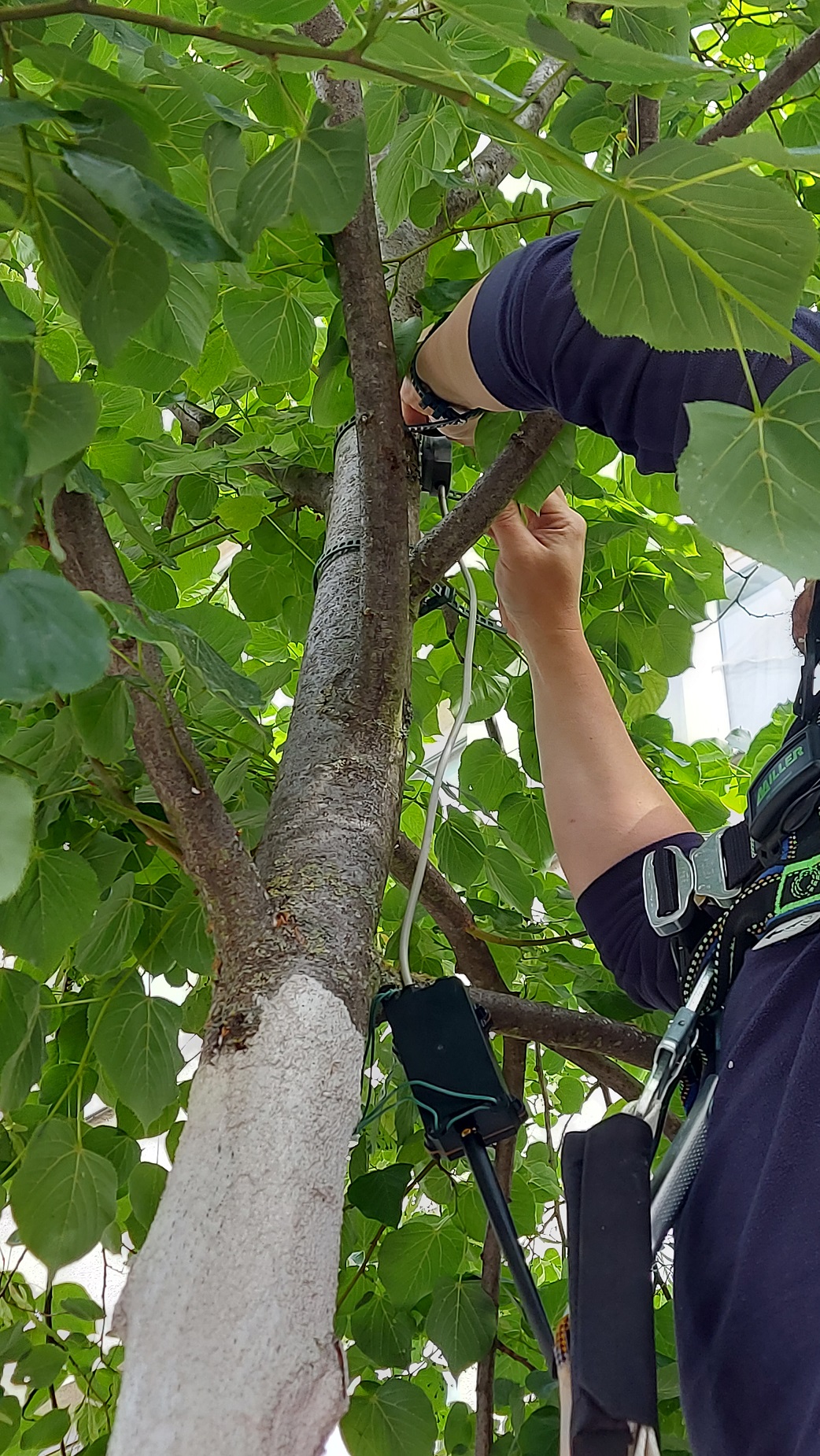 Um den Verbrauch insgesamt zu senken, verfolgt Sör nun einen neuen Ansatz: Zuerst soll der aktuelle Wasserbedarf der Bäume ermittelt werden. Dazu testet die Fachabteilung Baum aktuell drei verschiedene Sensortypen, die kontinuierlich entweder die Bodenfeuchte oder den Wassergehalt direkt im Holz messen. So lässt sich die aktuelle Bodenfeuchte ermitteln und die Gießintervalle können gezielt angepasst werden. Das Projekt läuft seit März 2025 und wird bis zum Frühjahr 2026 erprobt.
