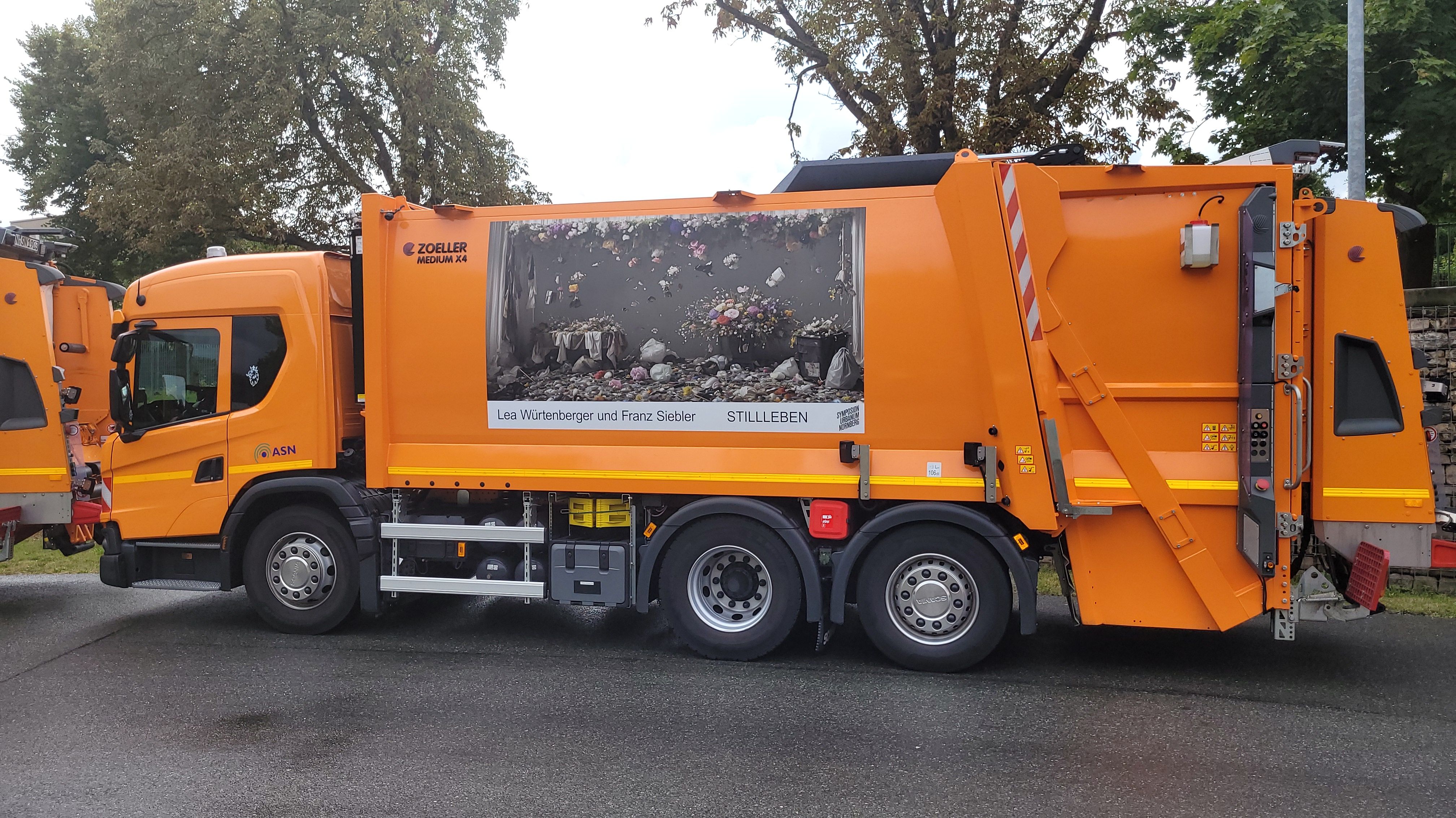 Die fünf Werke der Preisträgerinnen und -träger sind nun auf den Abfallfahrzeugen zu sehen: Maximilian Gesslers Beitrag „Die Müllbeutel sind voll“ zeigt nebeneinander arrangierte gefüllte Müllbeutel, die auf die wichtige Rolle der Haushalte im Recyclingprozess hinweisen und eine korrekte Mülltrennung einfordern.