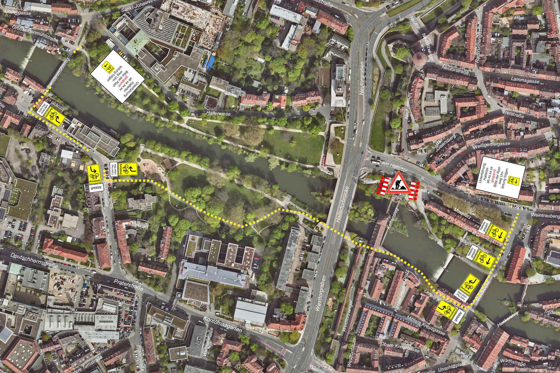 Fußgängerinnen und Fußgänger können von der Straße Am Hallertor den Treppenabgang zum Hallertürlein nutzen. Von dort führt die Unterführung unter der Hallertorbrücke direkt zur Hallerwiese. Das Pegnitzufer bleibt erreichbar.