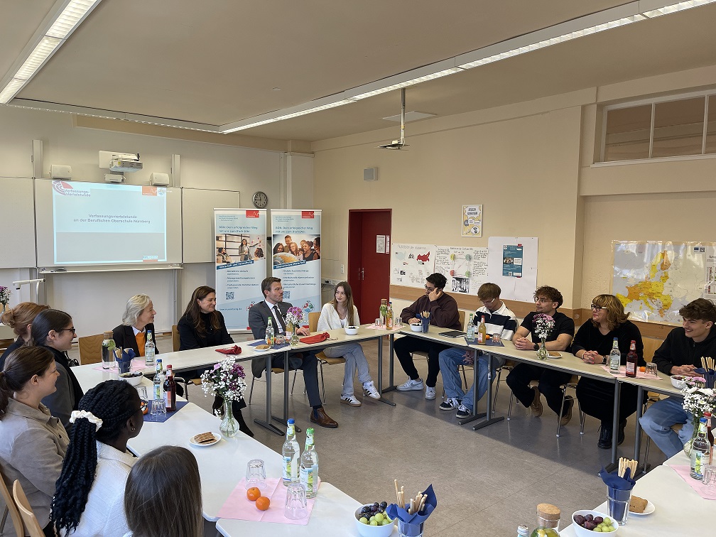 Oberbürgermeister Marcus König zeigte sich beeindruckt von der Umsetzung der Verfassungsviertelstunde an der Beruflichen Schule 13: „Demokratie ist keine Selbstverständlichkeit – sie lebt vom Mitmachen! Die Verfassungsviertelstunde ist ein starkes Signal: Wertevermittlung wird hier nicht nur theoretisch behandelt, sondern fest im Schulalltag verankert. Ich freue mich, hier zu erleben, wie Demokratiebildung in Nürnberg gelebt wird – mit Freude, Herz und Haltung.“