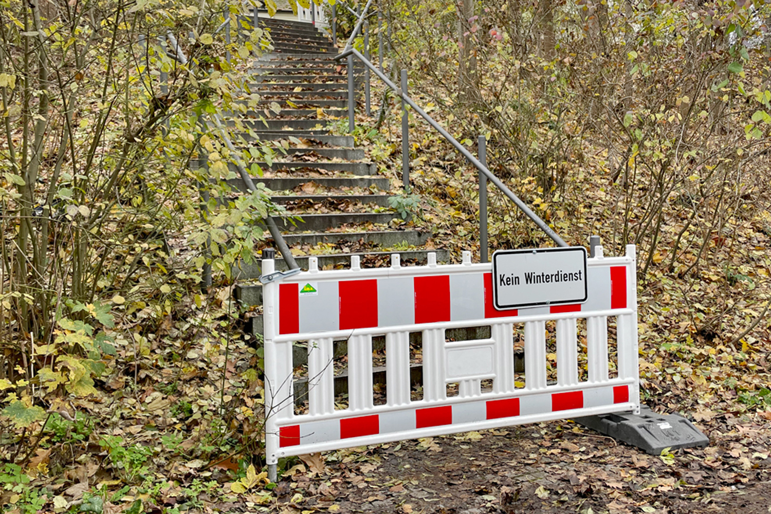 Alle vom Winterdienst ausgenommenen Treppen werden mit rot-weißen Absperrschranken versehen und mit dem Hinweis „Kein Winterdienst“ gekennzeichnet. Diese Absperrungen bleiben – unabhängig von kurzfristig frostfreien Phasen – bis Anfang April 2026 bestehen.