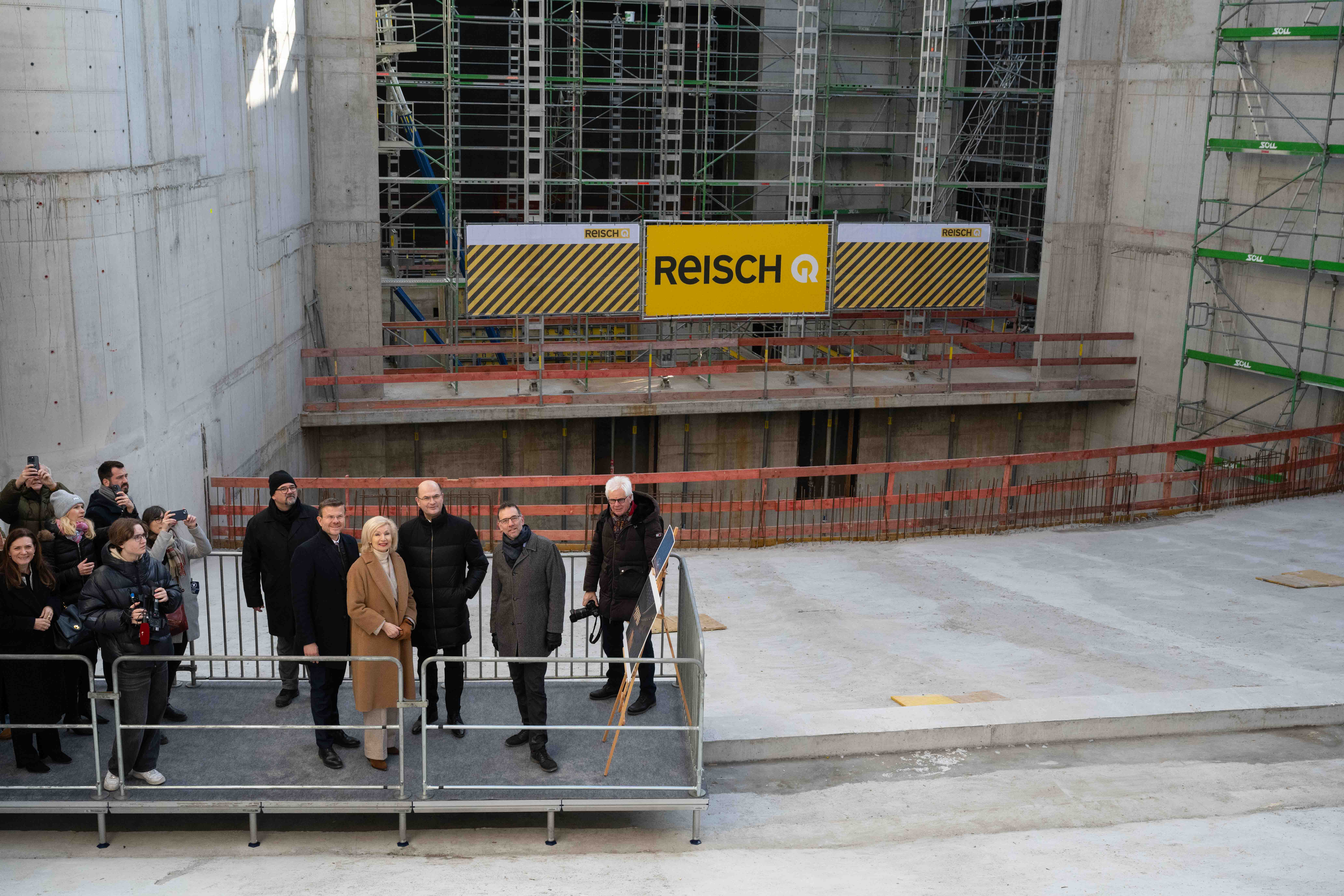 Im Rahmen der Baufeier am heutigen Freitag, 23. Januar 2026, mit rund 250 Gästen wurde diese Verbindung zwischen dem denkmalgeschützten Hauptgebäude und dem sogenannten Ergänzungsbau im Innenhof der Kongresshalle symbolisch vollzogen. Oberbürgermeister Marcus König, Staatsminister Albert Füracker, Bürgermeisterin Prof. Dr. Julia Lehner und Planungs- und Baureferent Daniel F. Ulrich haben einen der Übergänge geöffnet, durch die künftig das Publikum von den Foyers im Kongresshallen-Rundbau in den Theaterbau gelangen wird.