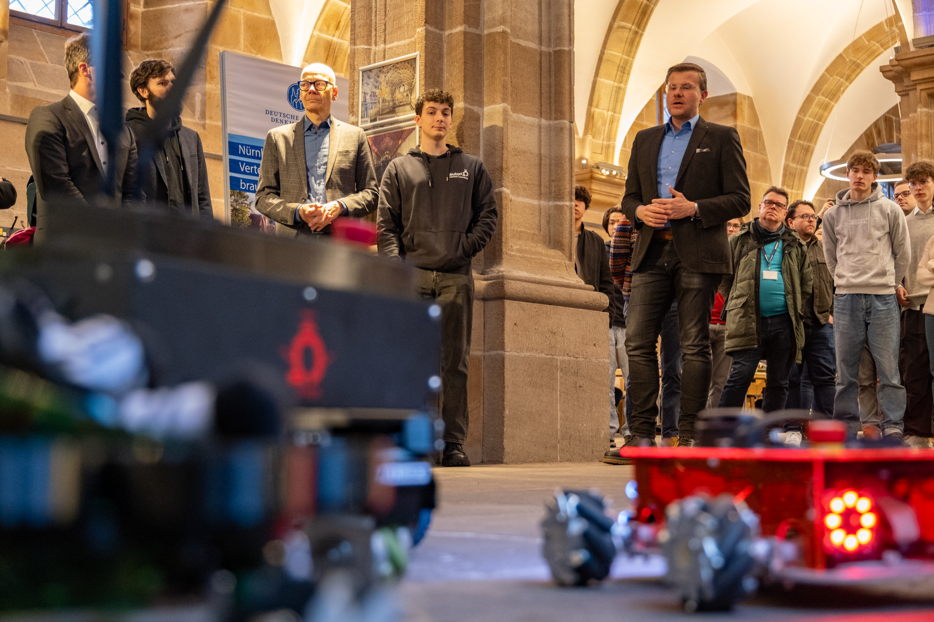 In der historischen Ehrenhalle trafen dabei Tradition und High-Tech aufeinander: Umrahmt von der Geschichte der Stadt demonstrierten Schülerinnen und Schüler sowie Studentinnen und Studenten ihre selbstgebauten, autonomen Roboter – von helfenden Robotern in Fabriken bis hin zu komplexen Robotersystemen für den Katastrophenschutz.