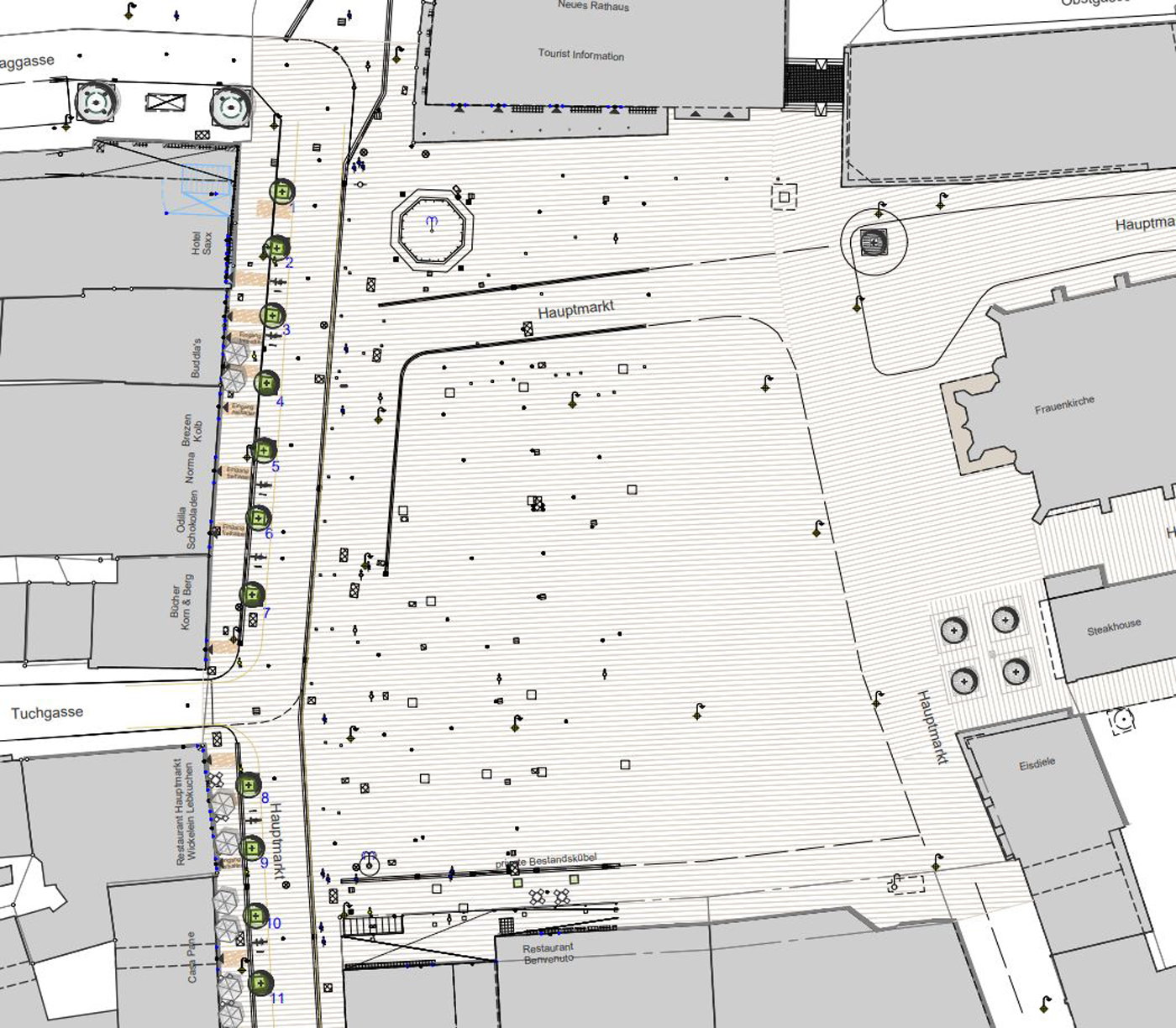 Für die neuen Baumstandorte wird der bisherige Taxistand in die Tuchgasse sowie in die nördliche Augustinerstraße verlegt. Der Hauptmarkt wird für unterschiedliche Märkte und Veranstaltungen genutzt. Durch die Flexibilität der mobilen Baumstandtröge bleiben alle Nutzungsmöglichkeiten bestehen. Das Projekt wird aus Mitteln der Städtebauförderung „Lebendige Zentren“ des Bundesministeriums für Wohnen, Stadtentwicklung und Bauwesen gefördert. tom