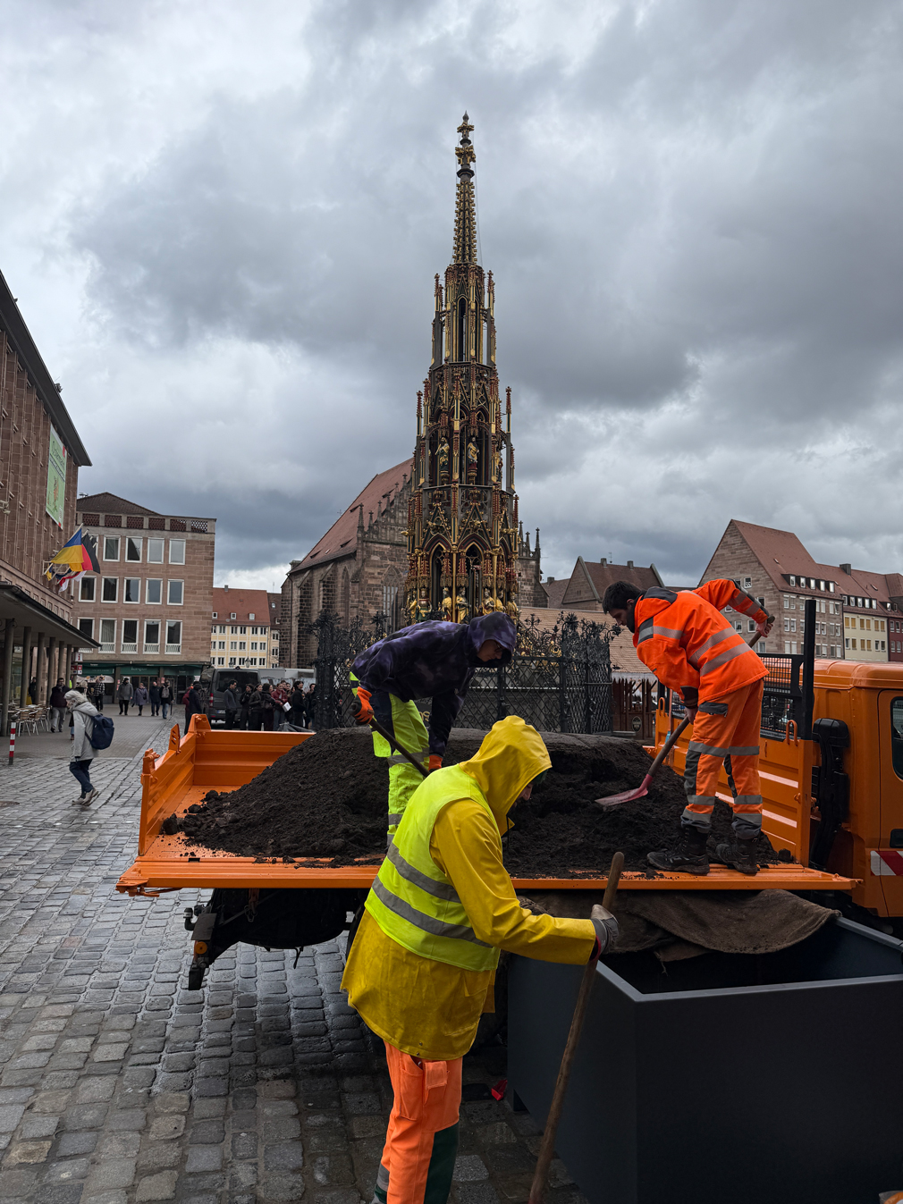 Bürgermeister und Erster Sör-Werkleiter Christian Vogel erklärt: „Mit diesem Pilotprojekt gehen wir den ersten wichtigen Schritt zu einer dauerhaften Begrünung des versiegelten Hauptmarkts. Die mobilen Bäume sollen Schatten spenden und für mehr Aufenthaltsqualität sorgen. Sechs der elf Baumkübel werden mit Sitzgelegenheiten ausgestattet und laden dazu ein, den Ausblick auf die Nürnberger Highlights wie Kaiserburg, Schöner Brunnen und Frauenkirche zu genießen. Im Laufe der Woche werden die Kübel vollständig platziert, mit Erde befüllt und anschließend die Bäume bepflanzt.“