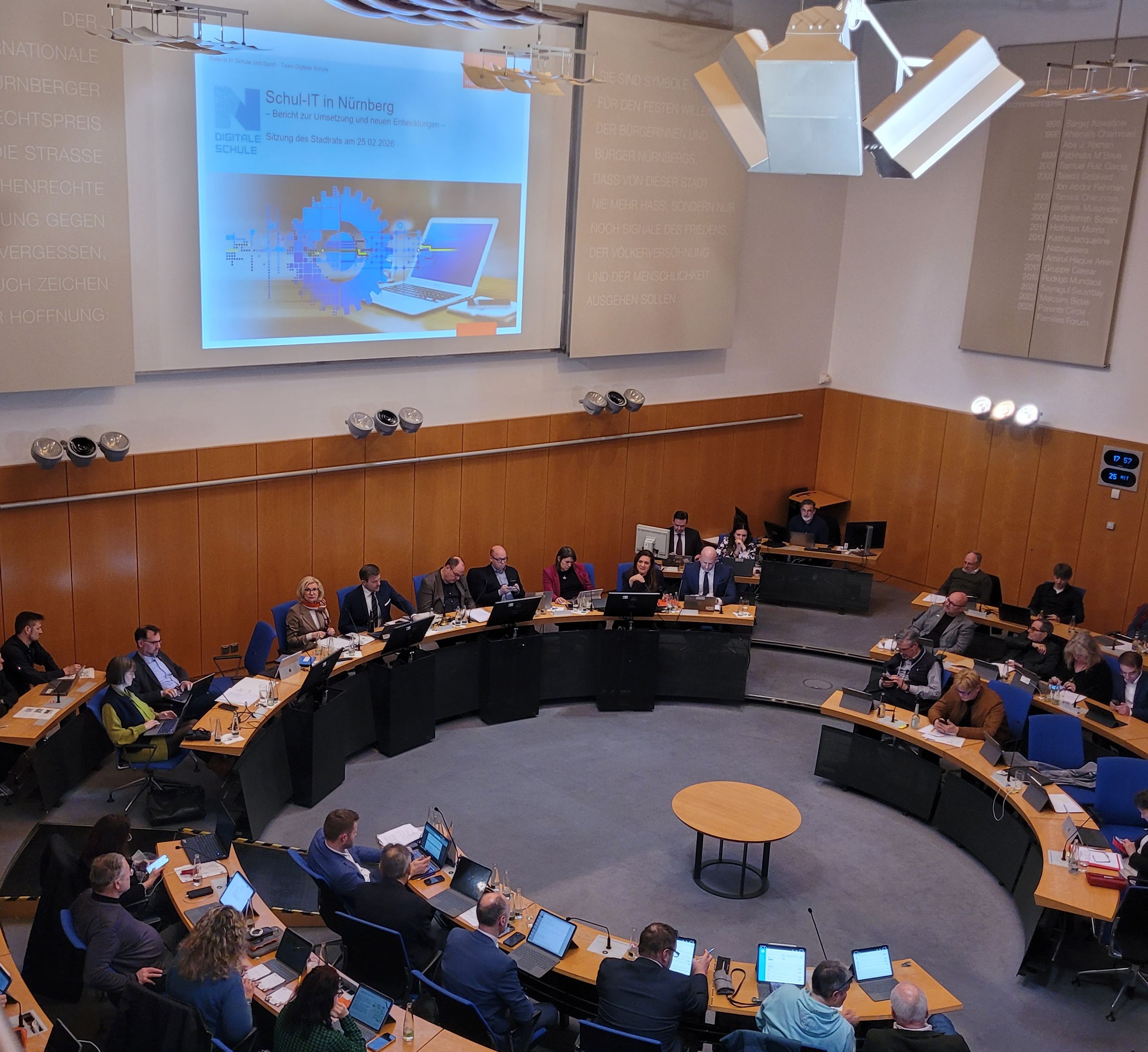 In seiner Sitzung am heutigen Mittwoch, 25. Februar 2026, hat der Stadtrat den aktuellen Bericht zur IT-Strategie „Lernen und Lehren an städtischen und staatlichen Schulen in Nürnberg im Digitalen Zeitalter“ beraten. Im Februar 2017 fiel der einstimmige Beschluss, für alle Nürnberger Schulen mit einer pädagogisch und strukturell abgestimmten Strategie zu verfahren. Nun, neun Jahre später, zieht das Referat für Schule und Sport eine umfassende Bilanz – und richtet zugleich den Blick auf die zukünftige dauerhafte Finanzierung der Schul-Informationstechnologie.